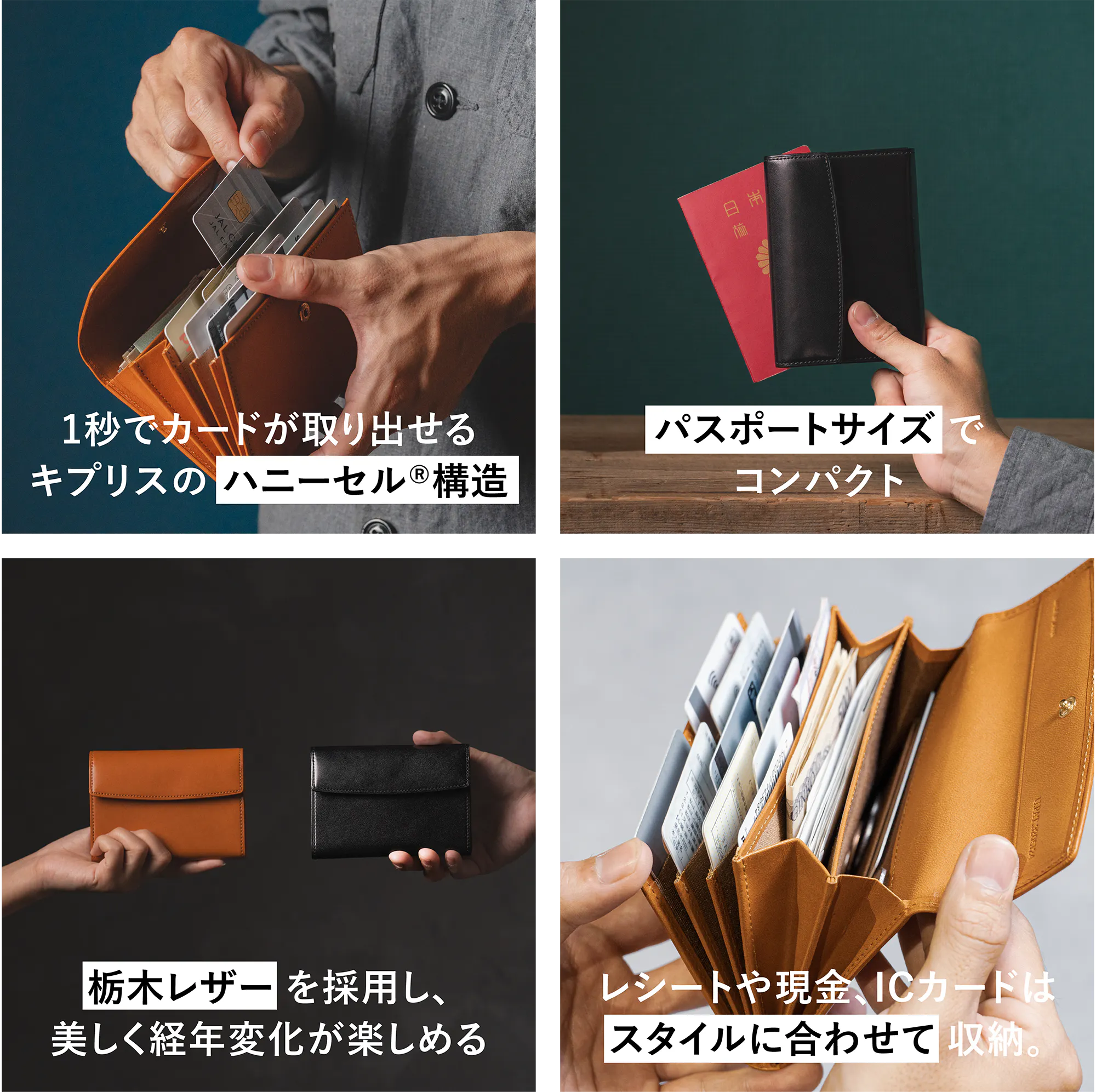 サイズはパスポートとほぼ同じサイズ。カードが12枚入る財布でありながらこれだけコンパクトなのは、キプリスのもつハニーセル®︎構造だからこそ。
