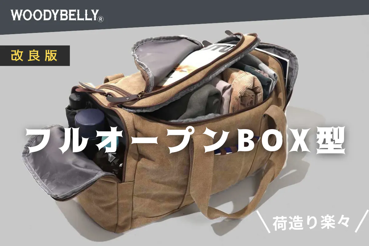 ・自立式BOX型帆布ボストンバッグはコインロッカーや座席にも収まる旅行にちょうどいいサイズ感。