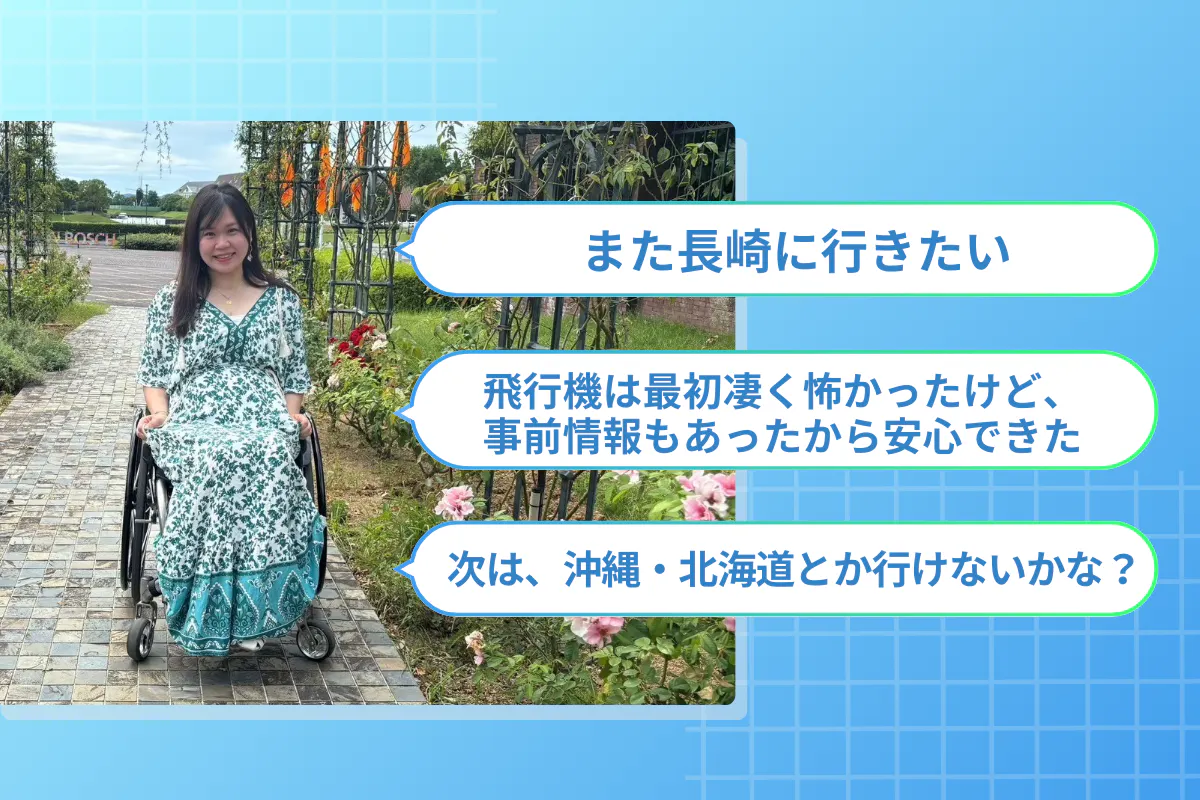 おでかけ・外出では多くの情報を自ら収集しなければならず、ふらっと。や長崎県ユニバーサルツアーセンター様からの情報提供や丁寧なサポートもあり、楽しむことができました。