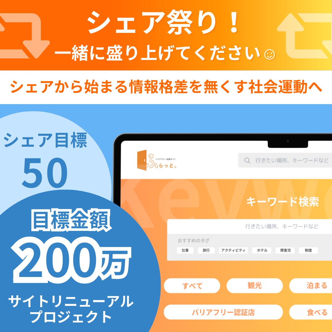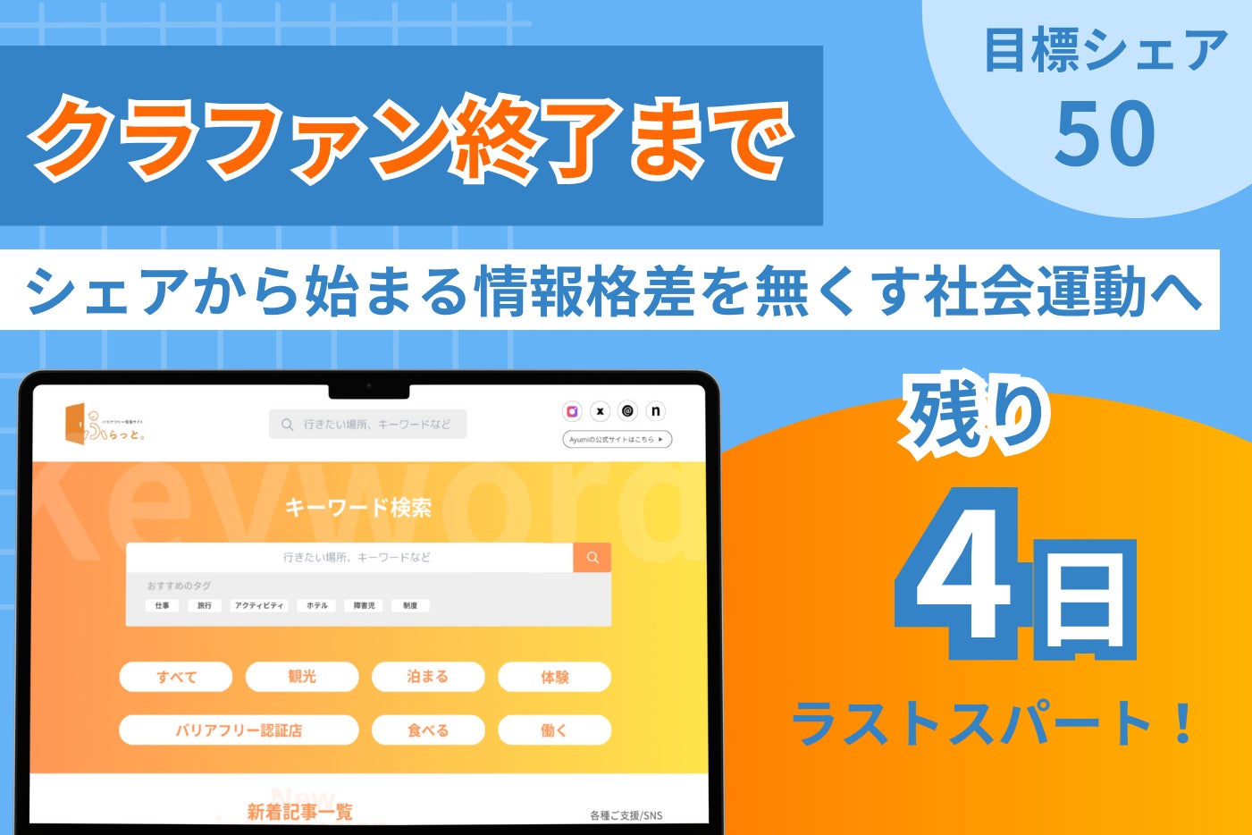 皆さんの応援のおかげで無事、目標金額200万円を達成することができました!!!達成することが、飛び跳ねるくらい嬉しいのと、現時点での支援者192名の4分の1(50名程度)はAyumiを知らなかった人です。”今までAyumiのサイトや活動を知らなかった人””情報格差という社会課題があることを知らなかった人”に届いているということです。このこともすごく嬉しいです!皆さんの応援シェアから、このように広がっていくことを感じています。本当にありがとうございます^^表題にもある通り、ネクストゴールを設定しました!■目標金額:250万円■目標支援者数:250名■目標応援拡散:250シェア現状の数字は、支援金額:201万円支援者数:192名応援拡散:222シェアです!ファーストゴールでは、WEBサイト改修メインの費用として設定させていただいていました。今回の+50万円は以下の3つの施策に使わせていただこうと考えています。1:以下の人たちにも届けるためにも記事をより多く作るため・高齢者(3,640万人)・視覚障害者(31.2万人)・聴覚障害者(29.7万人)・ADHDなどの発達障害者(48.1万人)・医療的ケア児(2万人)※現在、1記事あたり35,000円のコストがかかるためその費用に充てていきます。2:1年以上前に出された記事のサムネイル変更より視認性が高く、サムネイルを見てどんな記事かわかるようにするためにデザインの変更を行います。(以下、デザイン修正されたのサムネイル)3:Google検索でAyumiの記事が上位表示させるための施策(SEO対策)Ayumiの記事の中でも10位以内に表示されない記事も一部あります。SNSを通じて読まれているけど、Google検索から読まれることが少ない記事に対して、上位表示する(5位以内に検索ヒットさせる)ような対策のための費用です。※以下の検索キーワードはAyumiの記事が上位表示できている一部内容です。