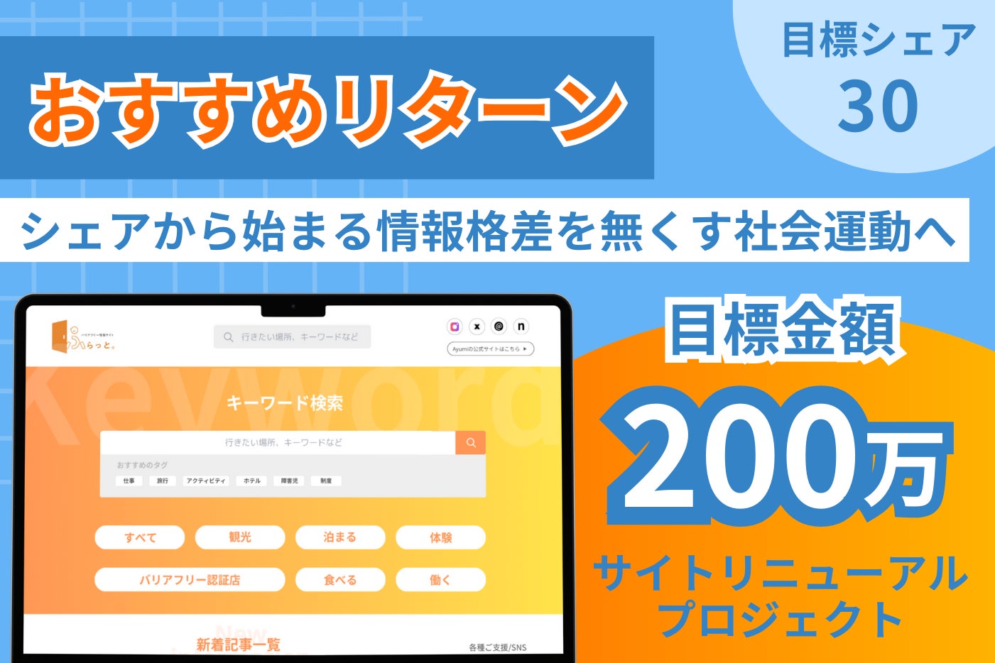 ■クラウドファンディング開始から13日後の支援状況支援者数:120人支援額:1,406,000円達成率:70%■2024年12月19日18時時点の総シェア数Facebook:54X:36Instagram:34合計:124今日も2人から応援メッセージを紹介していきます^_^株式会社神崎工務店 福岡営業所 所長 吉村私は普段”障がいがあるお子様”や”車椅子を利用されている方”の在宅生活を快適にするための『住まい』環境整備を主な仕事としております。住まいが充実すると『外出』に目が行く方が多いです。外出には多くの経験やワクワクが詰まっている行動だと思います。ただし、今の社会では外出先などで様々なバリアが存在しています。もちろんバリアフリーな場所もありますがその情報が多くの方に届いていない現状もあります。そんな社会を変えたいと熱い思いでバリアフリー情報サイトを運営されている一般社団法人Ayumiさんを尊敬し応援しております。このプロジェクトをきっかけに多くの方の『外出』が増えていくことを祈っております。そう君ママ情報が知りたいけどその情報に辿り着けない。息子を育てる中で何度もそのような経験をしてきました。Ayumiは、当事者やその家族でないと気づけない細やかな情報を「当事者ならでは」の目線で発信されています。外出への不安な気持ちや行きたいという気持ちを「ここなら行けるかもしれない」と後押ししてくれるそんな情報サイトです。情報格差を無くしたい!という山口さんの熱い思いがより多くの方に届くよう応援しています。----------------------■WEBサイトのアップデートが起こす未来(恥ずかしながら...)サイトを立ち上げた2022年12月時点、月間PV数は2,000程度でした。SEO対策を学びながら、記事についても当事者にヒアリングを重ねてAyumiにしか出せない記事を常に意識して運営してきました。その結果、今はでは月間PV数は10万を超えるサイトになってきました。ですが、閲覧数が増えると共に、多くの課題に直面しています。今回のWEBサイトのアップデートは、その課題を無くしていくと共に、それぞれの分野に精通する情報を持つ人たちに情報提供・監修にも入ってもらいながら新着記事やリライトを行っていく予定です。そして、WEBアップデートが完了し、記事作成におけるAyumiへの協力者を増やすことで、車椅子利用者(200万人)に加えて、・高齢者(3,640万人)・視覚障害者(31.2万人)・聴覚障害者(29.7万人)・ADHDなどの発達障害者(48.1万人)・医療的ケア児(2万人)上記の方々にも情報提供ができる体制を整えていくことを想定しています。自分たちができることを積み重ねてきたAyumiだからこそ、今後は他の方々の協力も得つつ、情報格差をなくすためのメディア作りに、誰よりも本気で真摯に取り組んでいきます。30秒、山口に時間をください。クラウドファンディングページをご覧いただき、このプロジェクトが情報格差を無くす一手になると、私たちの将来に必要なプロジェクトであると共感してくださった方は是非支援・拡散をお願いします。