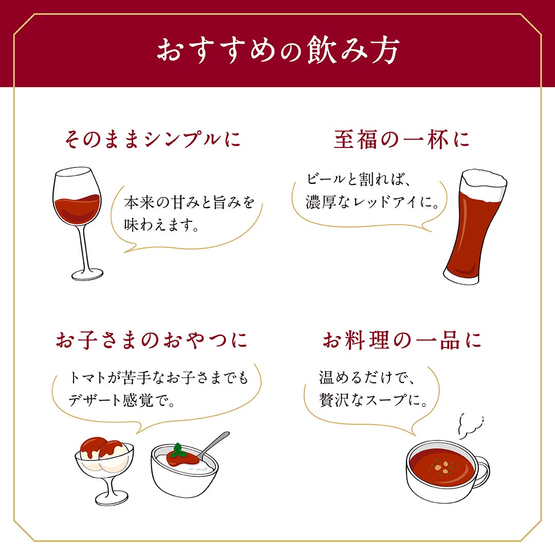 トマピカルネクターは、甘美な味わいが特徴で、アルコールを控える方や多様な世代の方々に喜ばれる、上質な飲料として新たな風を吹き込みます。最大約70粒分の果肉を100%使用し、添加物や水を一切加えず、トマトの本来の濃厚な旨味をぎゅっと閉じ込めました。