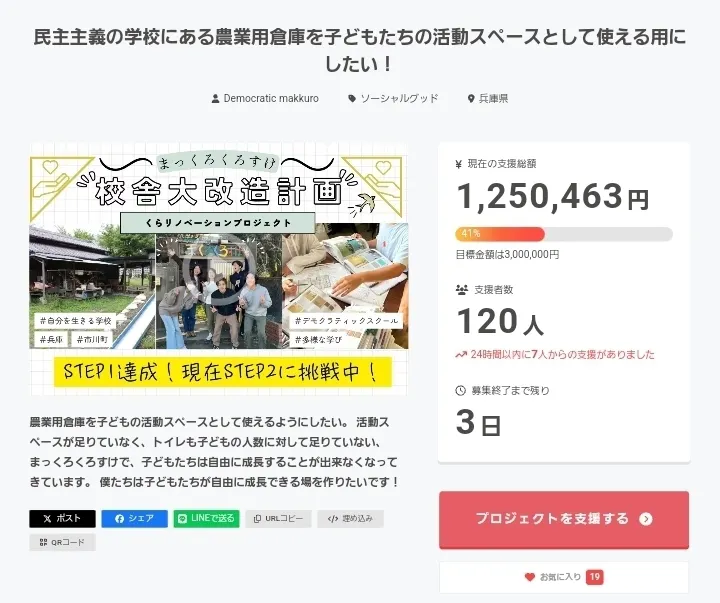 2025/03/16 09:19皆様、ご支援ありがとうございました( *´艸`)僕は今、すごい経験をしているのかも知れません。デモクラティックスクールでしか出来ないことをやっているのかも知れませんけど。今日でクラファン終了するんですけど、目標は達成できませんでした。でも謎の満足感に包まれています。何かは分からないけど、それでいいのかな?初めてのクラファン、ここまで来れて本当に嬉しいです。最後の日頑張ります。( ^ω^ )ありがとうございました。 もっと見る