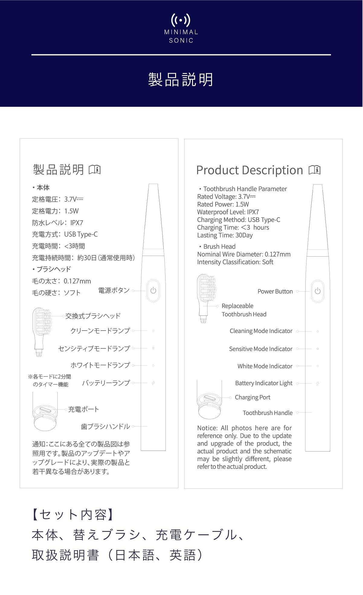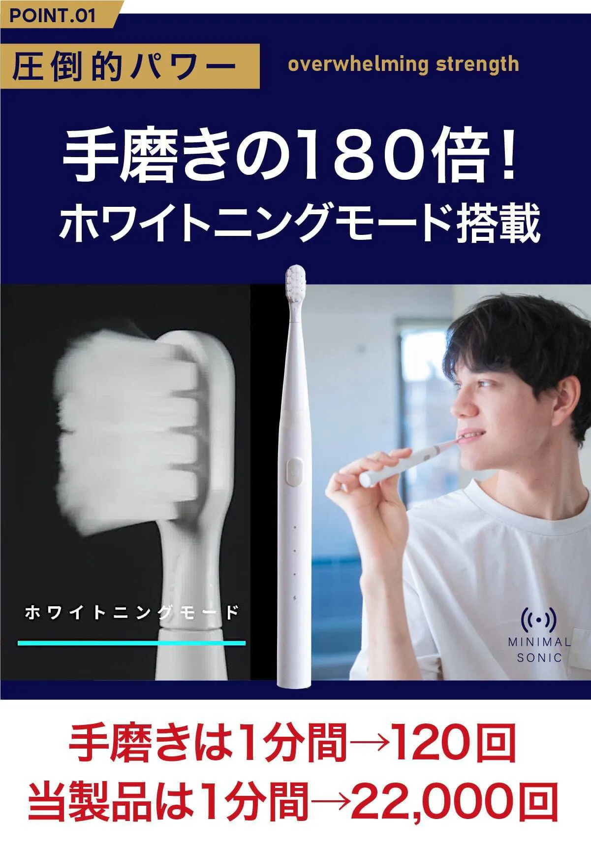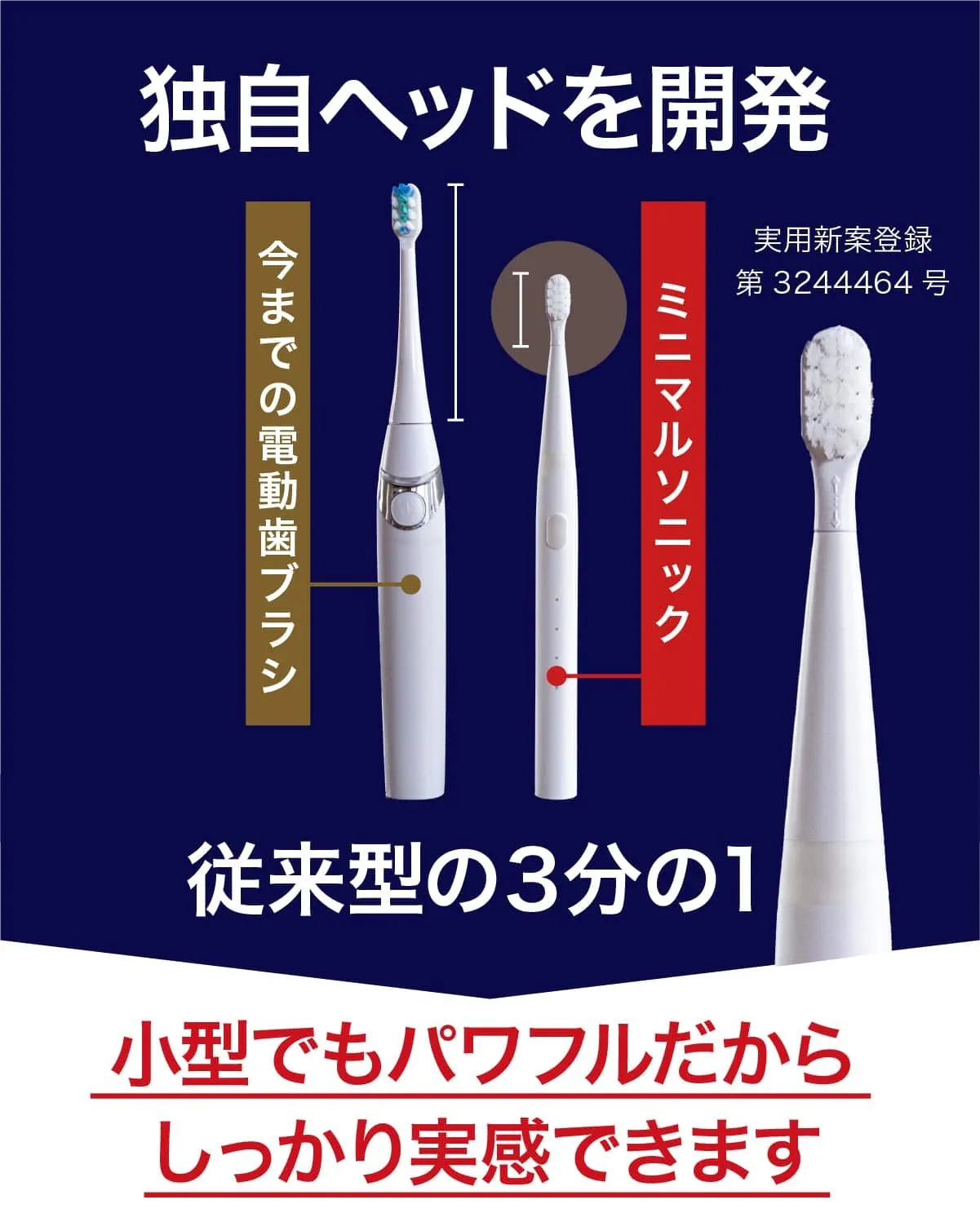 今までの電動歯ブラシを大きいと感じたことはありませんか?普通の歯ブラシから電動歯ブラシに変えた時にそれを大きく感じると思います。電動歯ブラシは構造上、大型化してしまうのですが、常識に囚われずまったく新しい電動歯ブラシを設計したのがこのミニマルソニックです。新発想の構造で小型でパワフル。未来の体験をはじめましょう。