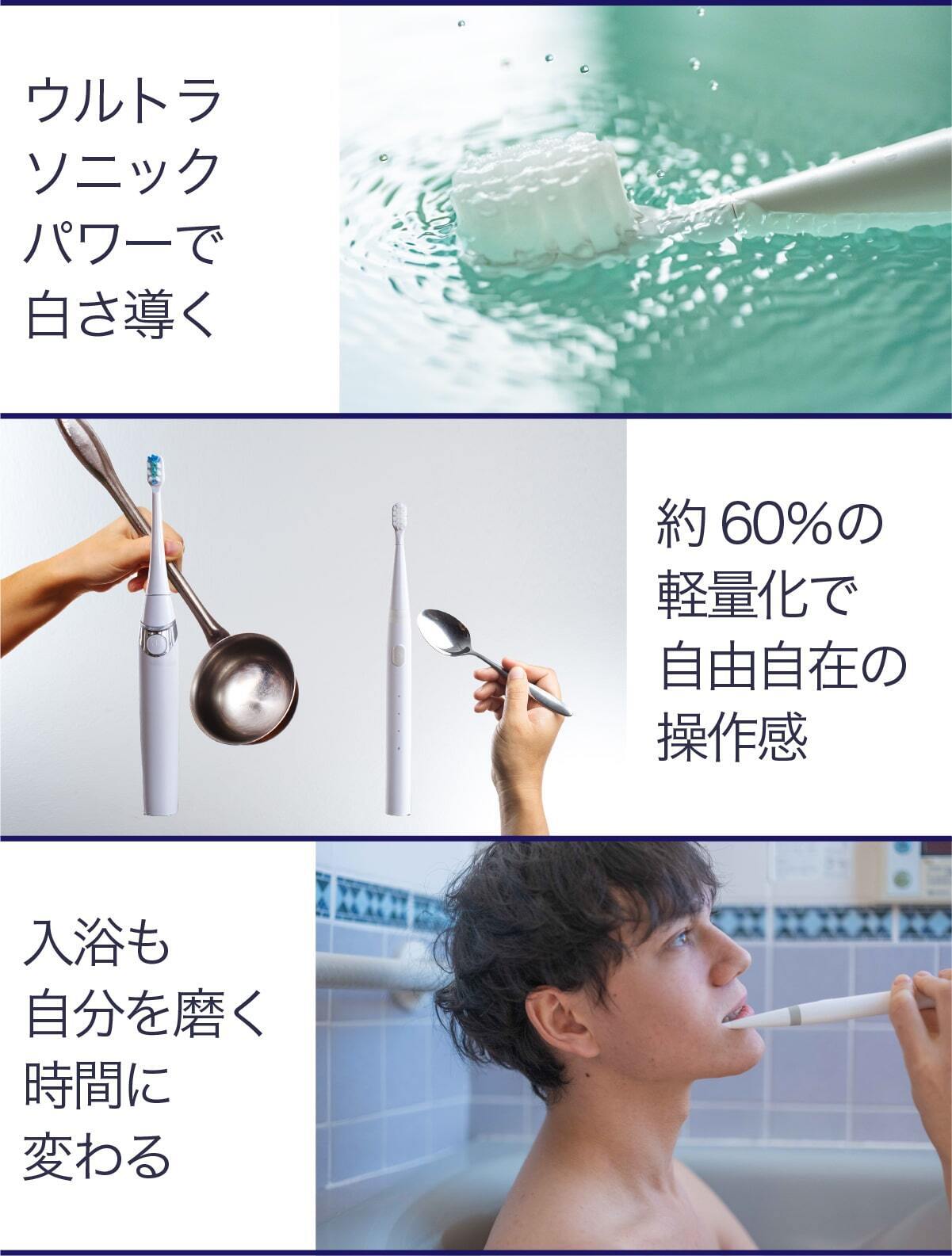 従来比約60%軽量化に成功、かつウルトラソニックパワー搭載、そしてリマインダー機能も。新しいガジェットを探している方にも、電動歯ブラシ未体験の方にも、2台目を探している方にも最適です。