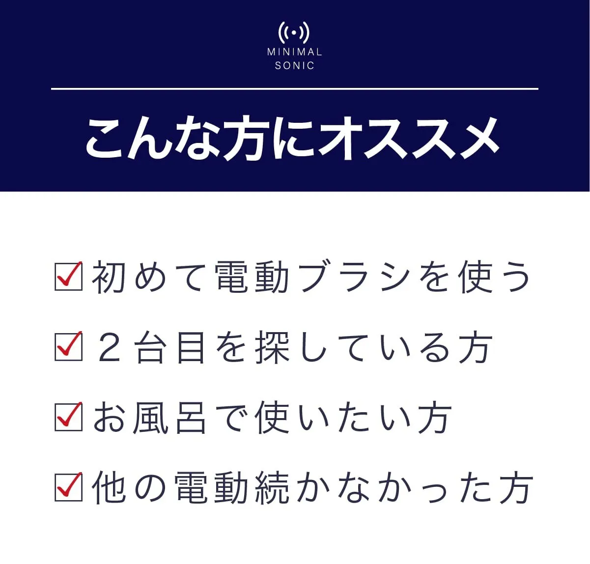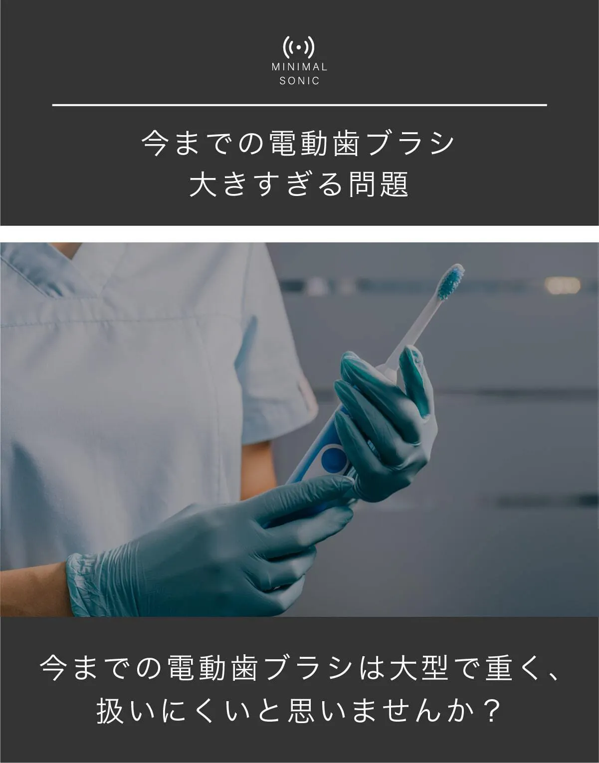 私達は日本の電動歯ブラシ普及率22%をなんとかしたいと考え、ミニマルソニックを誕生させました。口腔内のケアは大変重要なものであるにも関わらず、そのツールの進歩はまだまだです。ミニマルソニックが少しでも日本の電動歯ブラシ普及のきっかけになれば大変嬉しいです。