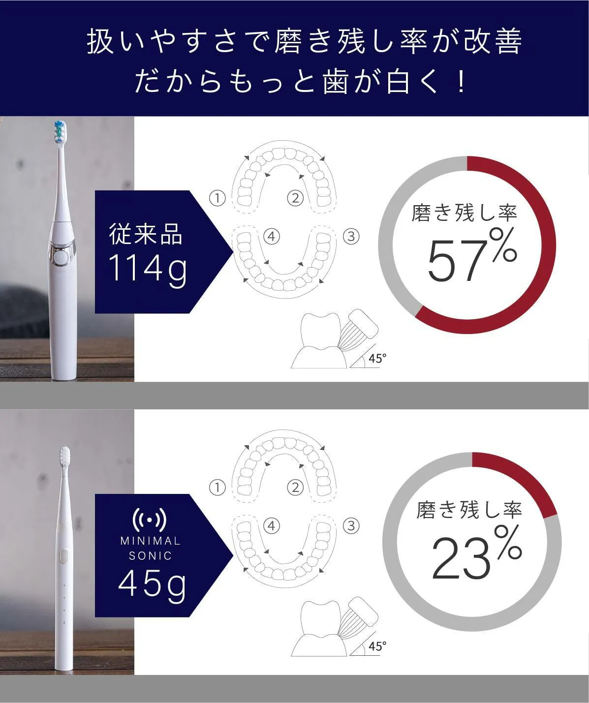 電動歯ブラシの普及率は先進国の42%と比べて、日本は22%と言われています。まだまだ普及が必要だと私達は考えミニマルソニックが普及のきっかけになればと思っています。