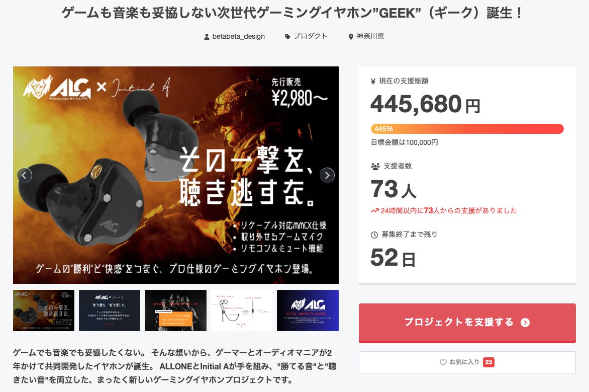プロジェクト開始から1日。すでに73名の方にご支援いただき、目標金額の445%を達成することができました!感謝!!