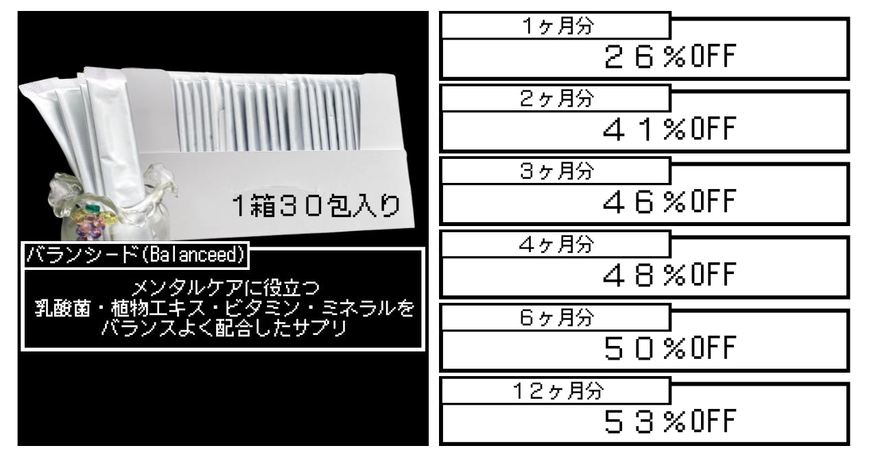 1,2,3,4,6,12ヶ月分のバランシードセットを用意しました。それぞれCAMPFIRE限定の特別割引でご提供いたします。1ヶ月分でも定価の26%オフとお得にはじめていただけます!