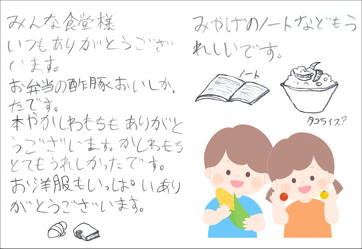 みんな食堂には、子どもたちからの手紙が届きます。その言葉に、みんな食堂を開催してよかったと思わざるを得ません。この喜んでくれる子どもたち、支援の輪が広がるよう、多くの地域で継続して開催していきます。