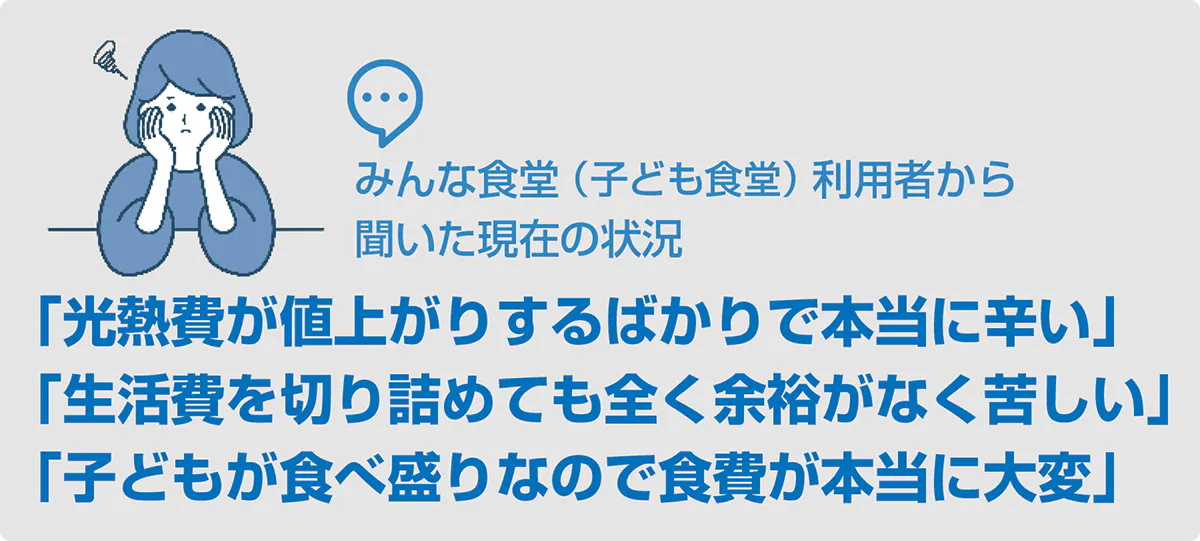 長引く円安による物価高は家庭を直撃し、ひとり親家庭の生活は更に苦しくなっています。生活費はかかるばかりで、子どもを育てていくのはとても大変な状況といえます。もちろん両親家庭においても苦しい状況の子育て世帯は多くを占めています。