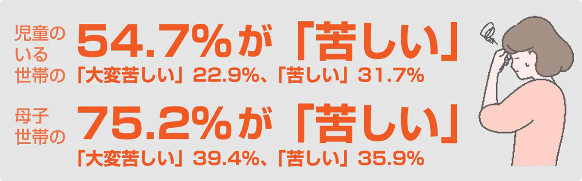 生活意識の状況 として、「苦しい」の割合は、「児童のいる世帯」では 54.7%(大変苦しいが22.9%、苦しいが31.7%)に、「母子世帯」では 75.2%(大変苦しいが39.2%、苦しいが35.9%)にもなっています。(※厚生労働省発表、2022年国民生活基礎調査より)