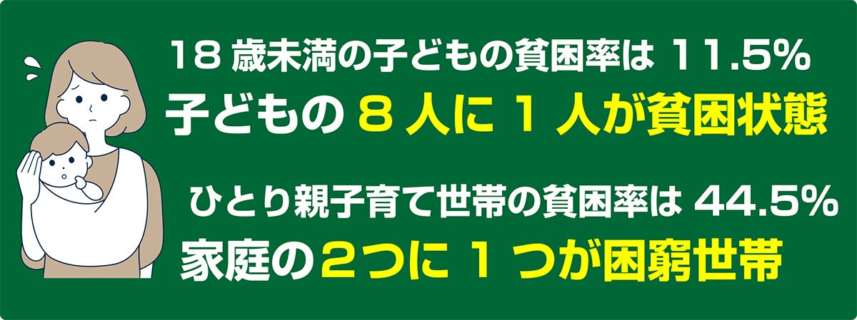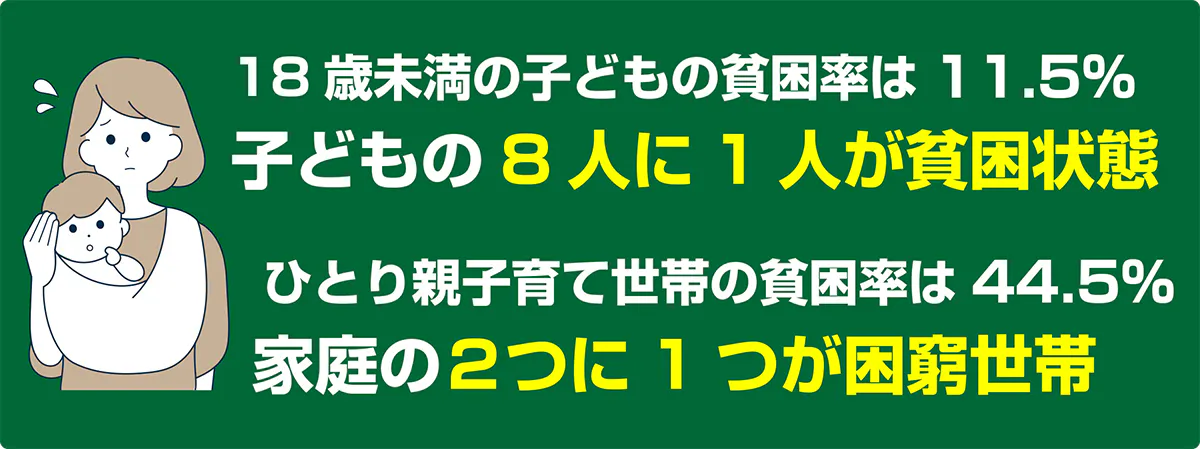 日本において、18歳未満の子どもの貧困率は11.5%、子どもの8人に1人が貧困状態となっています。大人一人で子どもを育てる世帯の貧困率は44.5%にもなります。(※厚生労働省発表、2022年国民生活基礎調査より、貧困率は大規模調査年のみ掲載)