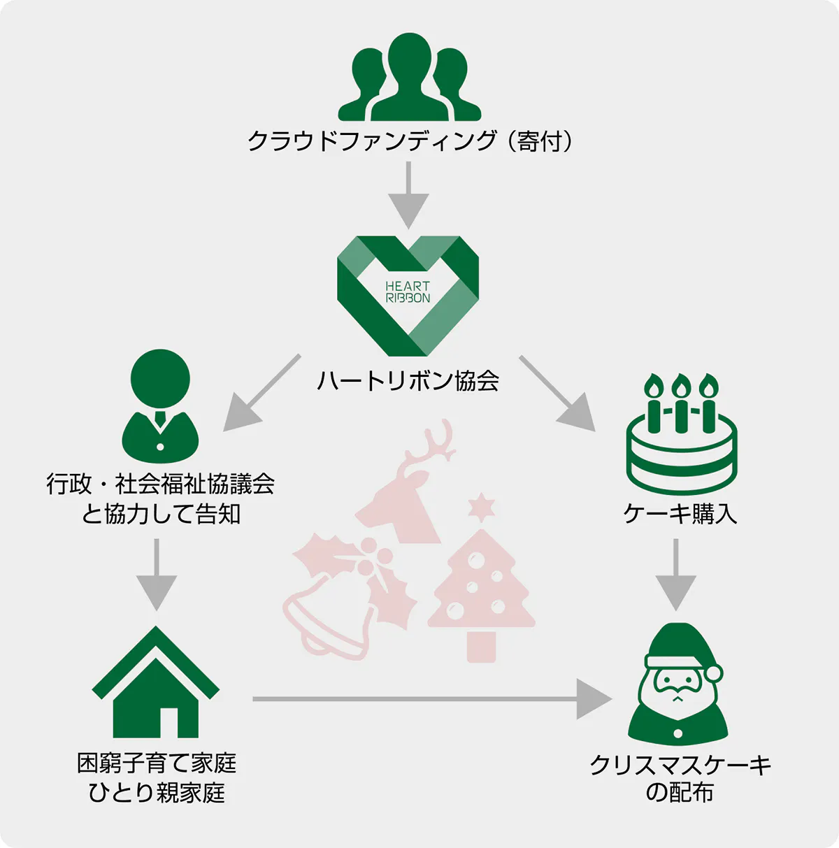 クリスマスケーキの資金は、今年もこのクラウドファンディングで集めます。ハートリボン大使からのメッセージが届いていますので、ぜひご覧ください。