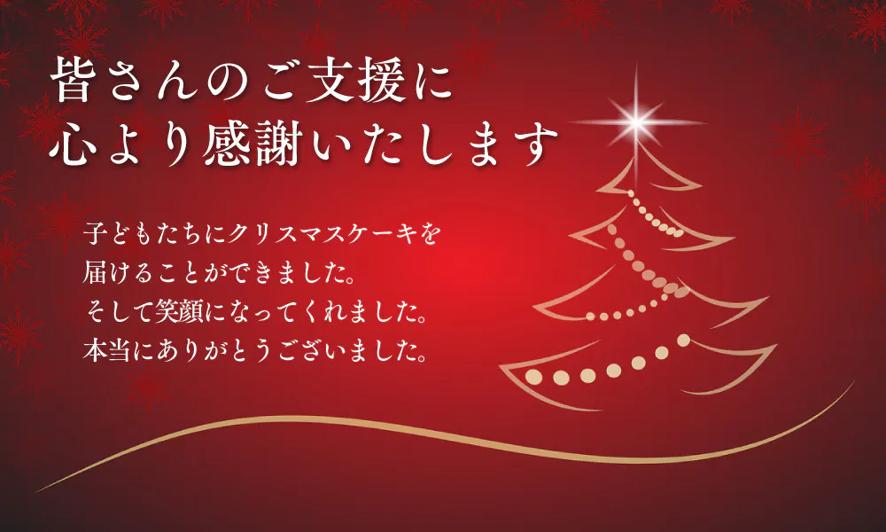 2025/01/21 22:522024年クリスマスに、多くの皆さんのご支援をいただき、子どもたちにクリスマスケーキを無事に届けることができました。本当にありがとうございました。心より感謝申し上げます。物価高が続く中、特にこの冬は天候不順で野菜が高騰し、大変な思いをしている子育て家庭はまだまだあります。私たちでできることは限られており、手の届く範囲で、できることとなりますが、少しでも多くの子どもたちが、クリスマスケーキによって楽しい時間を笑顔で過ごしてもらえたら嬉しいです。この度はご支援いただきまして誠にありがとうございました。あらためてご寄付いただきました全ての皆様に心よりお礼申し上げます。本当にありがとうございました。<クリスマスケーキをご寄付いただいた方々>クラウドファンディングのリターン条件に則り、3万円以上(クリスマスケーキ10個分以上)ご寄付いただいた方々をご紹介いたします。多額なご寄付をいただき誠にありがとうございました。◇株式会社ステラ・コーポレート様◇METイノベーション国際推進機構 萩原国博様◇がーどまん様◇ユーエスエヌ株式会社様◇千八百利休様◇株式会社ユニファイジャパン様◇八神サラ様◇株式会社カネスエ様◇オグリアスカ様◇DBX HLDGS株式会社様◇ナガタエリナ様◇株式会社バディ様◇加葉田博之様◇一般社団法人日本ポーカー連盟様◇株式会社タコール様◇有限会社前田重工業様◇株式会社グッドクールアソシエイツ様◇山本貴之様◇片岡秀征様◇株式会社エアーズ様◇株式会社RISE様▼以下に、ハートリボン協会に届いている声の一部をご紹介いたします▼クリスマスケーキが値上りし、高いと感じて、ケーキを買うのを迷っていました。娘は苺が大好きで、クリスマスっぽいショートケーキが欲しいと言っていたので大きいホールのケーキをいただけて、とても喜んでいました。サンタさんから受け取れて、写真にも快く対応してくださり、ありがたかったです。一緒にいただいた文房具もとても喜んでいました。できれば、毎年続けていただきたいです。クリスマスケーキ、美味しくいただきました! 物価の高騰する昨今、とてもケーキを買う余裕はありませんが、クリスマスケーキがあることで子どもはもちろん、親としても華やかなクリスマス気分を味わうことができました。ありがとうございました!ホールケーキは普段購入できないので子ども達がすごく喜んでました。素敵なクリスマスケーキをありがとうございました。テレビでしか出会えない方々とのお写真もドキドキ楽しい時間でした。物価高でひとり親には本当に厳しい生活状況になっています。そんな中色んなイベントや食料品などを提供して下さり本当に感謝しかありません。子供も親に気を使い欲しい物などは言いませんので無料でワンホールのケーキを頂けるなんてとても贅沢をさせて頂けてるなぁ〜と思います。子供と素敵なクリスマスを過ごせた事に感謝致します。皆様で温かく出迎えてくださり、美味しいケーキを子どもたちと一緒にみんなで食べました。ケーキがあるだけで、幸せな気持ちになりました。ありがとうございました。とてもありがたく嬉しかったです。お米すら買い控えている状態で、クリスマスケーキやプレゼントどころではなかったので、感謝の気持ちでいっぱいです。本当にありがとうございました!普段誕生日ですら十分にお祝いできないことが多いのに、今回はクリスマスケーキのプレゼントはとてもありがたいです。子どもたちにとっての人生初めてのクリスマスケーキを受け取りました。子どもたちはケーキをみて「わぁ、嬉しい!早く食べたい!」と大喜びでした。子どもたちの笑顔をみて、親としての心も救ってくださいました。改めてありがとうございます。息子が大きなホールケーキにびっくり!ホールケーキは買ったことありません。大きなケーキがある幸せをしみじみと感じさせていただきました。おかげで心も温まりました。おいしかったです!本当にありがとう!! もっと見る
