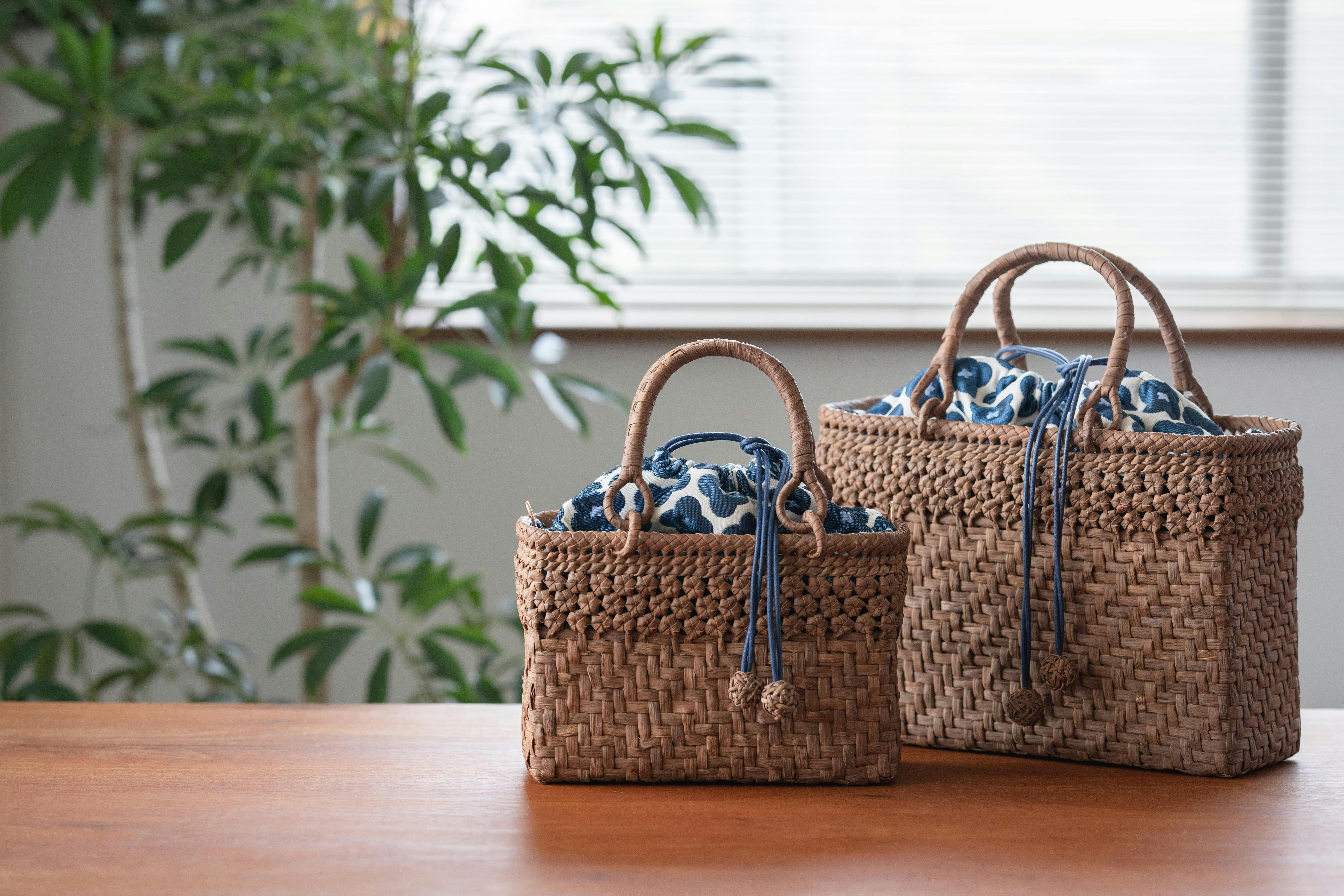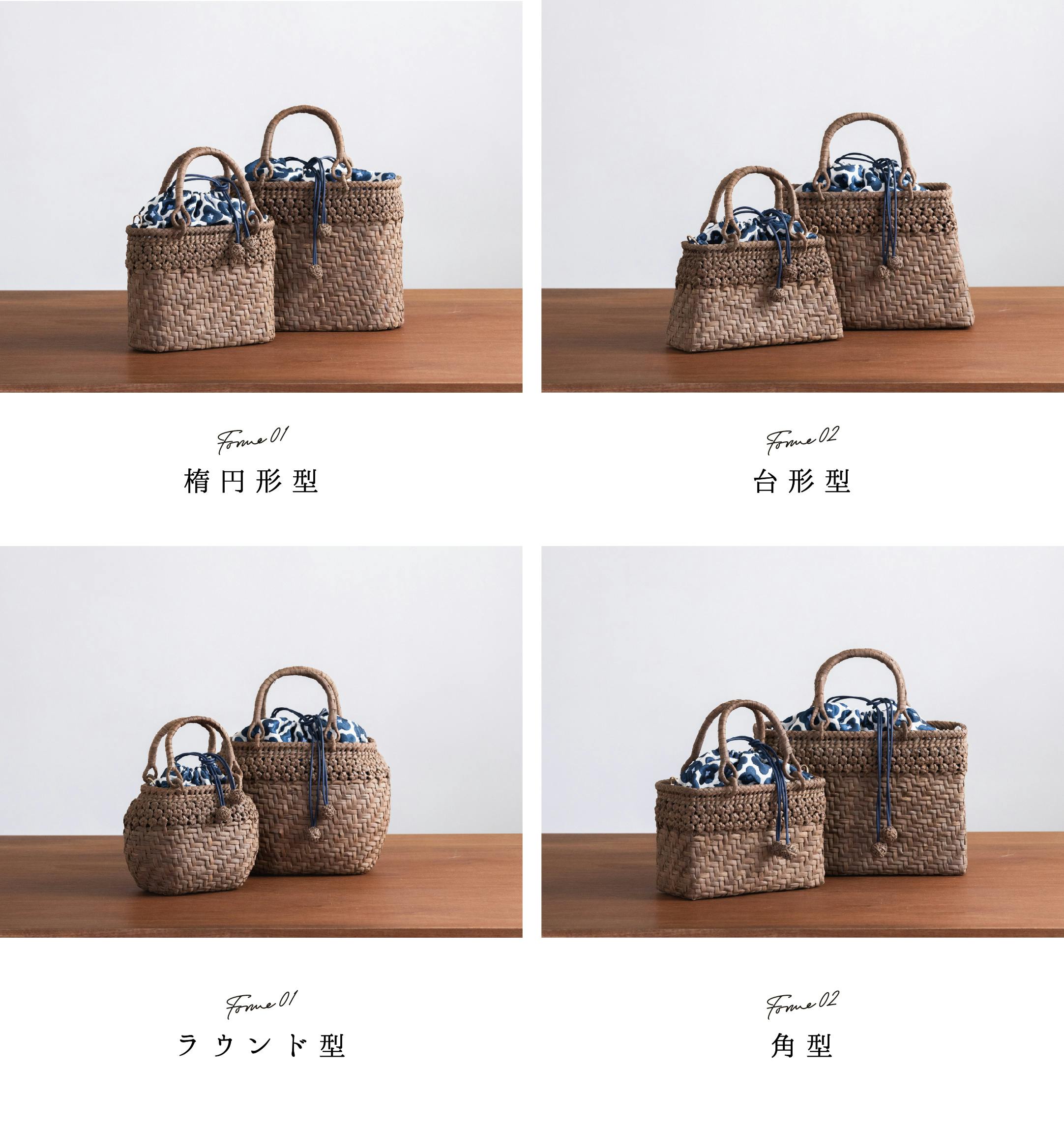 籠製品として、また、バッグとしてベーシックな形からフェミニンな印象のある丸みを帯びた形など4つのフォルムでデザインいたしました。皆さまの服装やお好み、お出かけスタイルに応じてお選びいただけましたら幸いです。