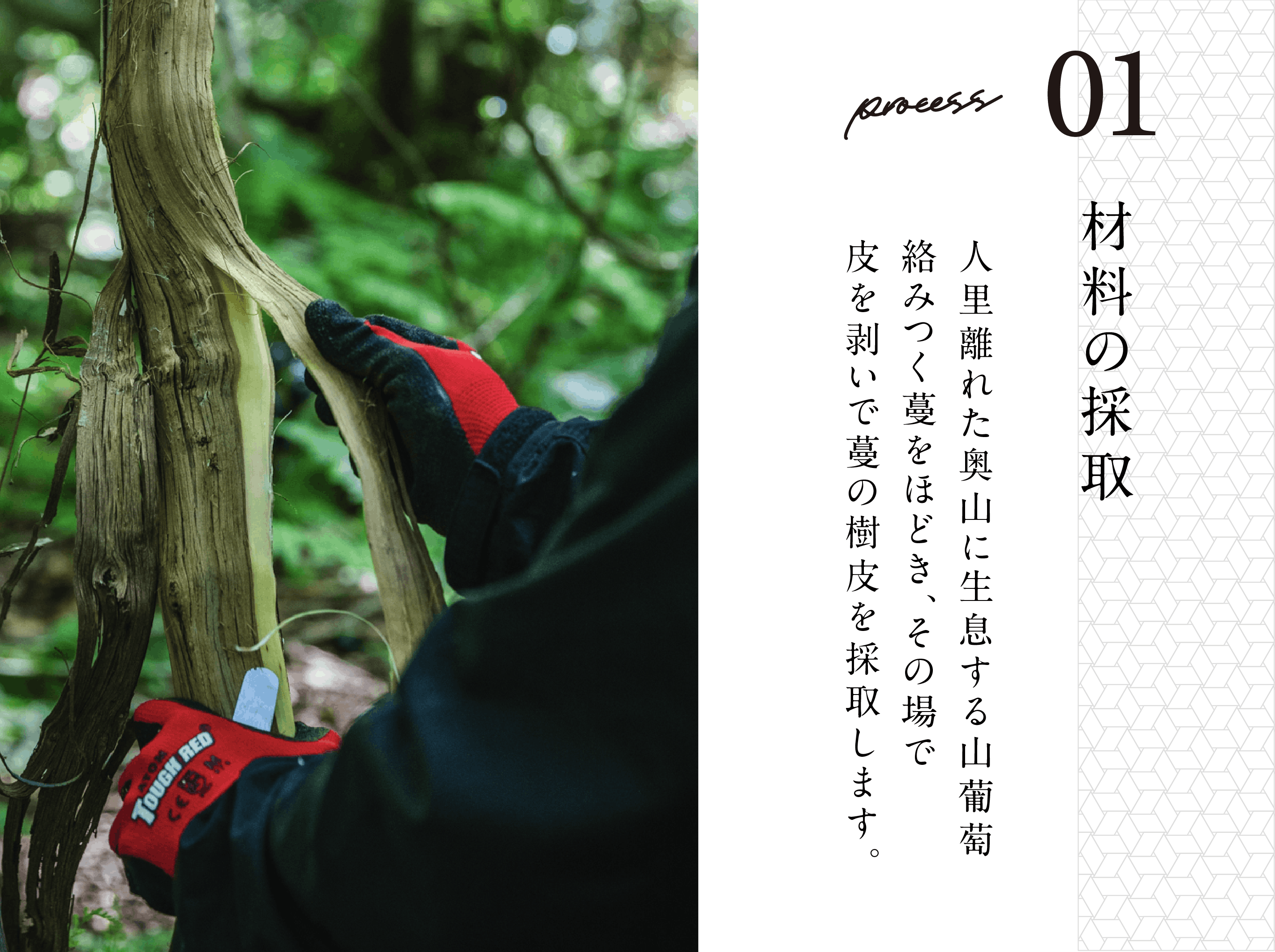 一年のうちのわずか2、3週間の梅雨の時期。奥山という、熊や猪などの野生動物が多く生息する人を寄せ付けないような山中で逞しく生育する山葡萄の蔓を採取します。採取時には木を10数メートル以上登り、絡みつく蔓をほどくようにして、可能な限り上の方で切ります。採取する蔓の大きさ(直径)には一定の基準を設け、基準値に満たない蔓は翌年以降に先延ばすことで種を枯渇させない工夫も行なっています。