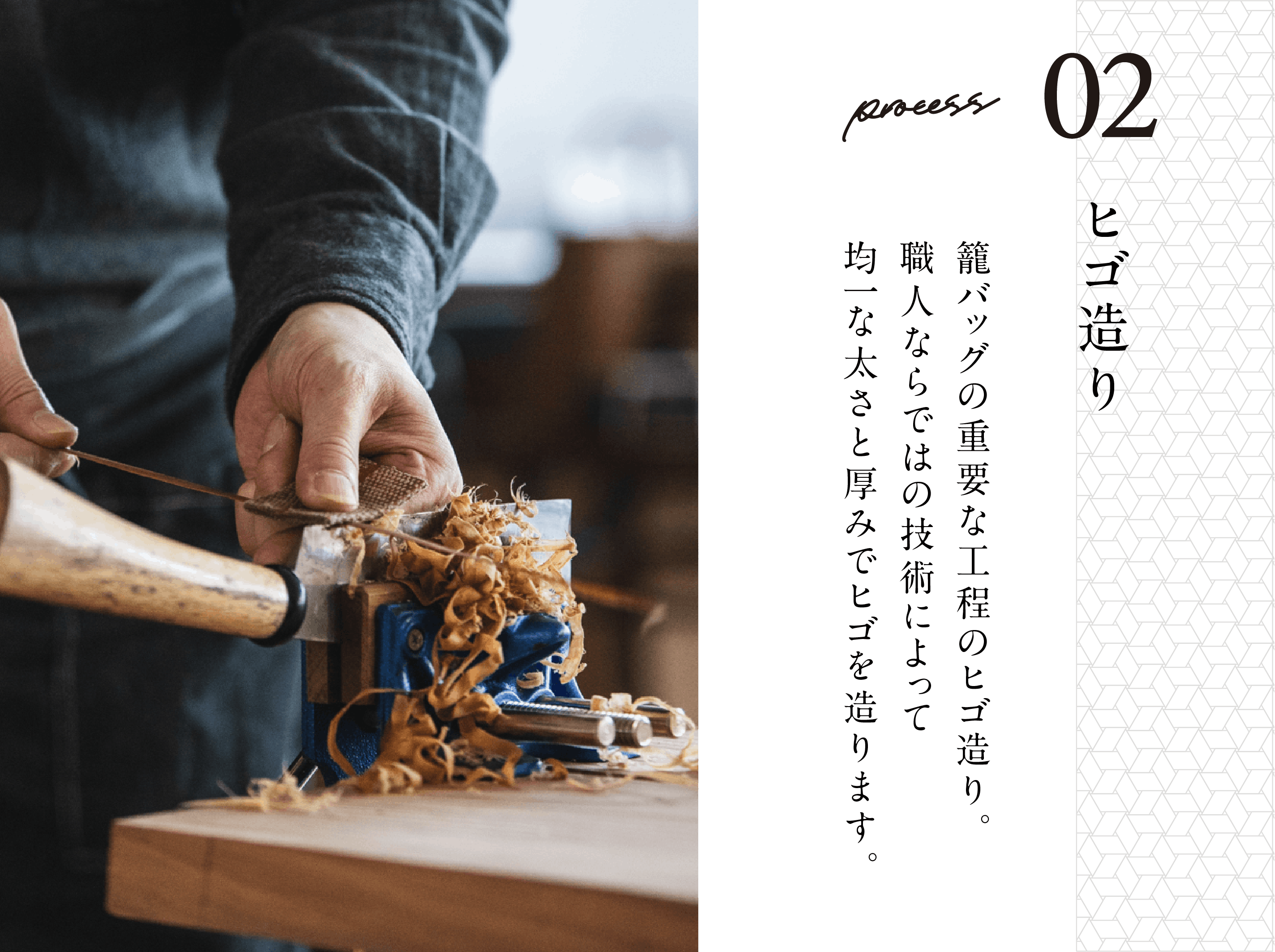 まっすぐなもの、曲がったもの、捻れたもの。天然素材の山葡萄の蔓には、一本一本に性格があり、柔らかくしなやかにするための鞣し(なめし)と削りの加工作業を経て均等な太さと厚みに切り揃えたヒゴを作ります。この工程はカゴ作りにおける最も重要な工程であり、完成の出来を大きく左右する、職人の技術が問われる工程でもあります。