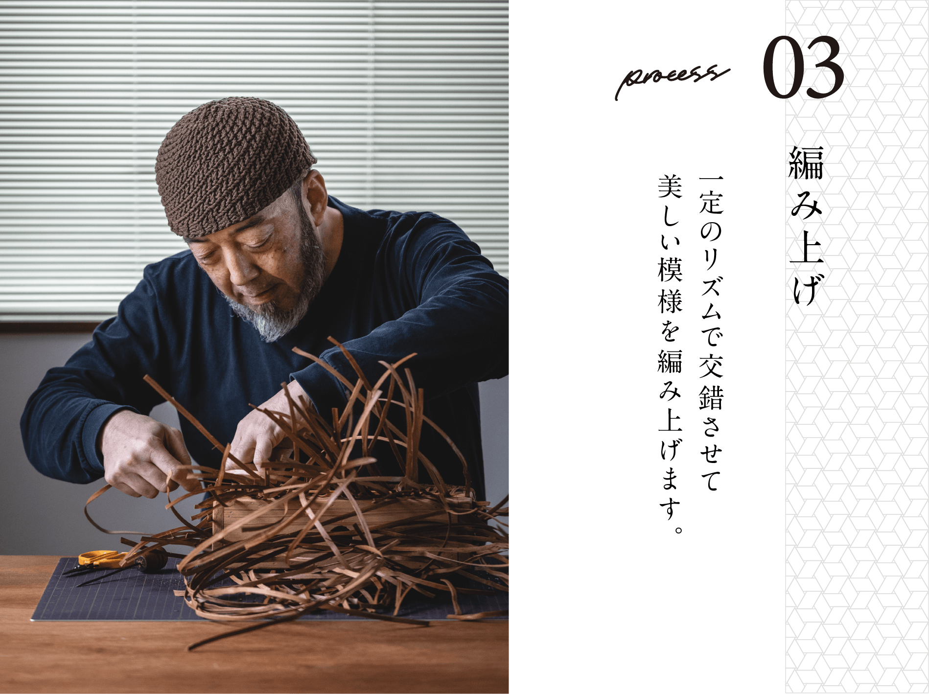 加工したヒゴを縦横に交錯させて籠の底部から編み、木型に巻き付けながら丁寧に隙間を埋めて編み上げます。乾燥させたヒゴを水に漬けて柔らかくし、編んではまた乾燥させて。この工程を何度も繰り返して少しずつ作業を進めるのでひとつの籠を編みあげるまでに多くの時間を必要とし、量産が難しいのですがひとつひとつの籠を丁寧に、丈夫で永く愛されるモノづくりを行なっています。