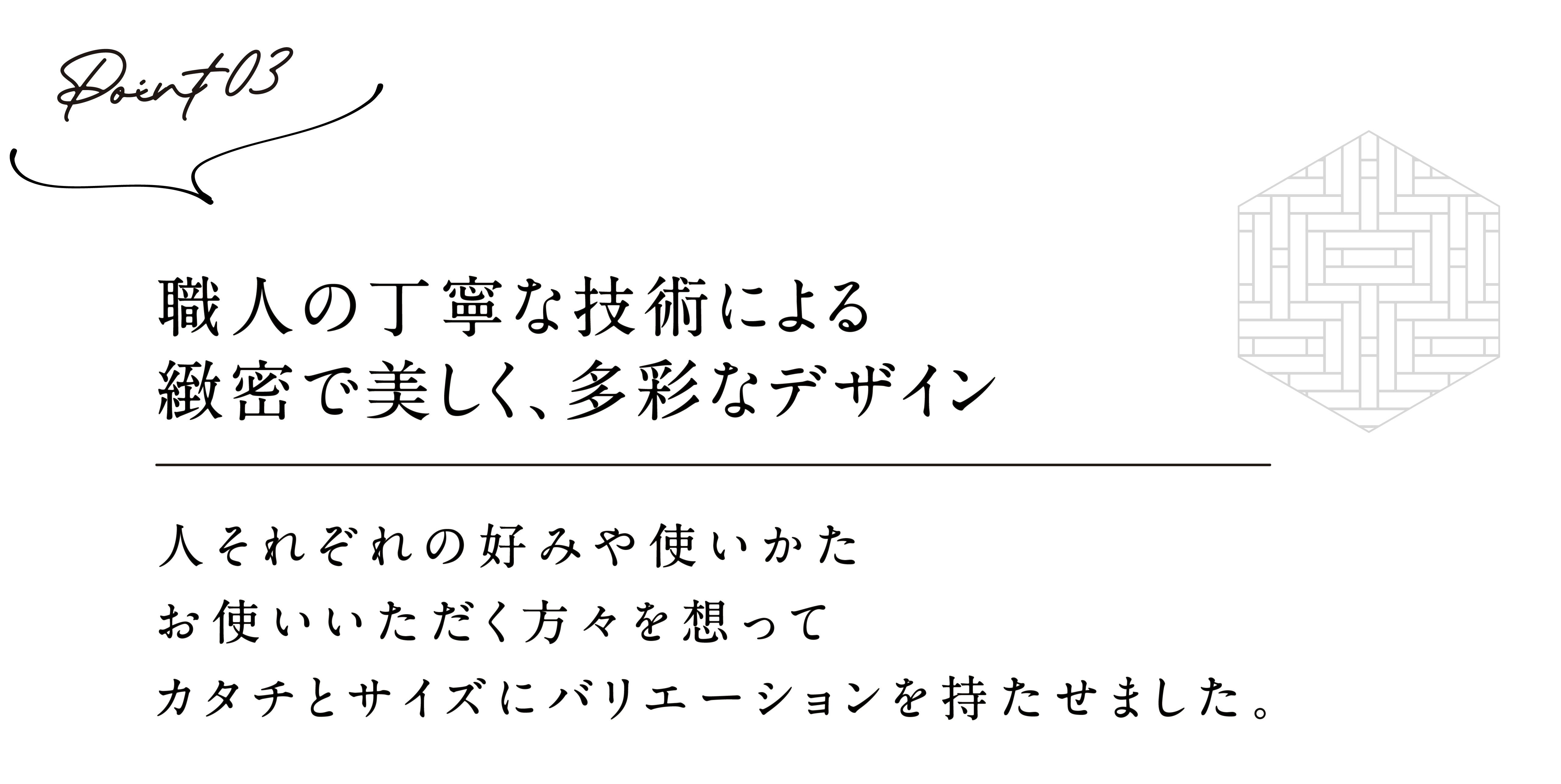 編み技術の最も長い歴史を持つ『網代編み』小さな花の粒が集まったような見え方の『六角編み』2つの編み方を組み合わせたデザインで編み上げました。