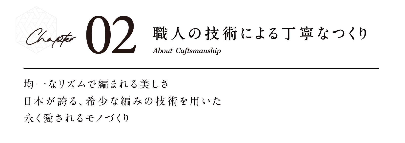 数百種類を超える編み模様を表現する丁寧な職人の技術により、幅広いデザイン性と、季節やシーンを問わず使える汎用性、永くお使いいただける耐久性が大きな特徴です。