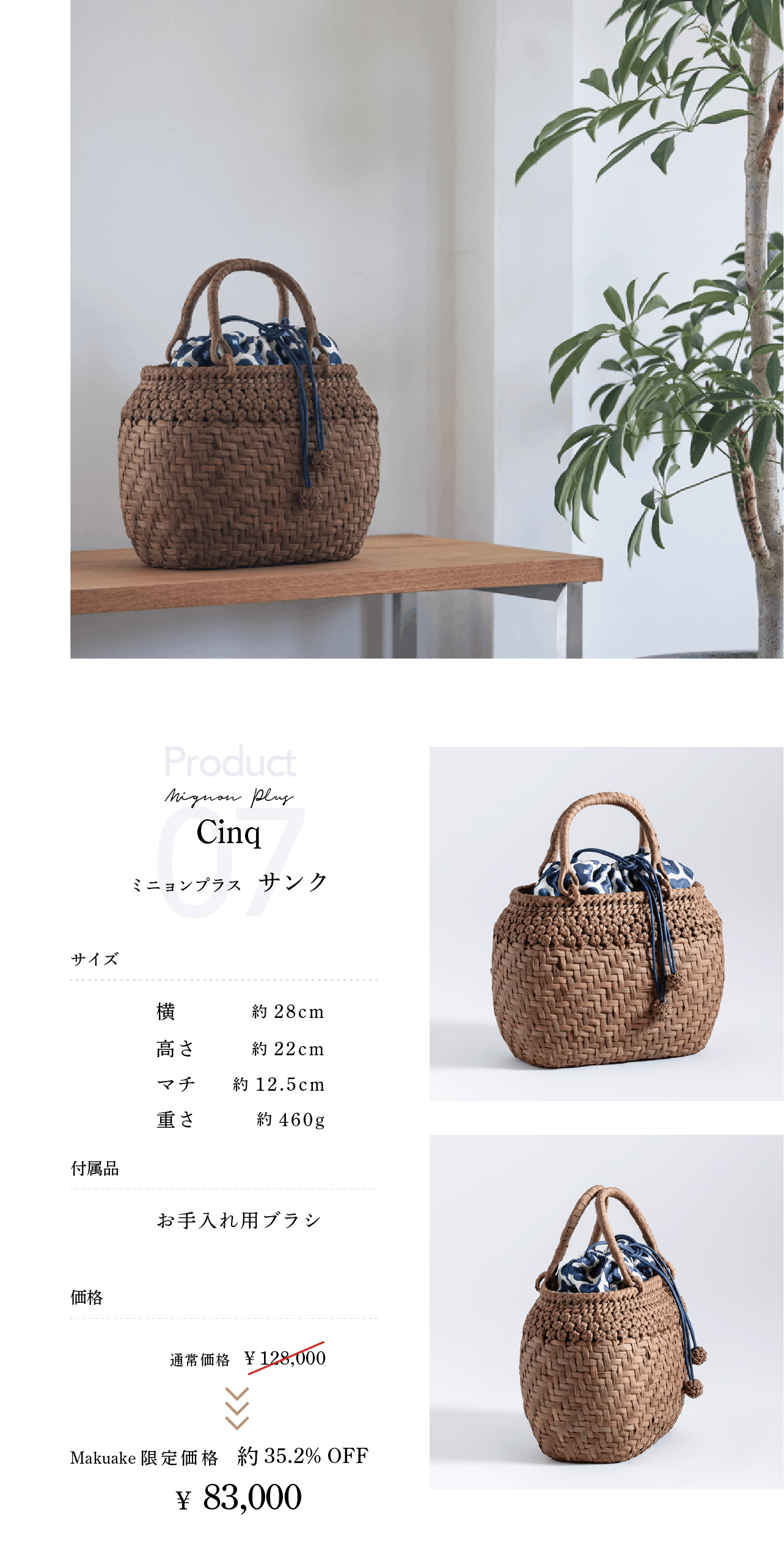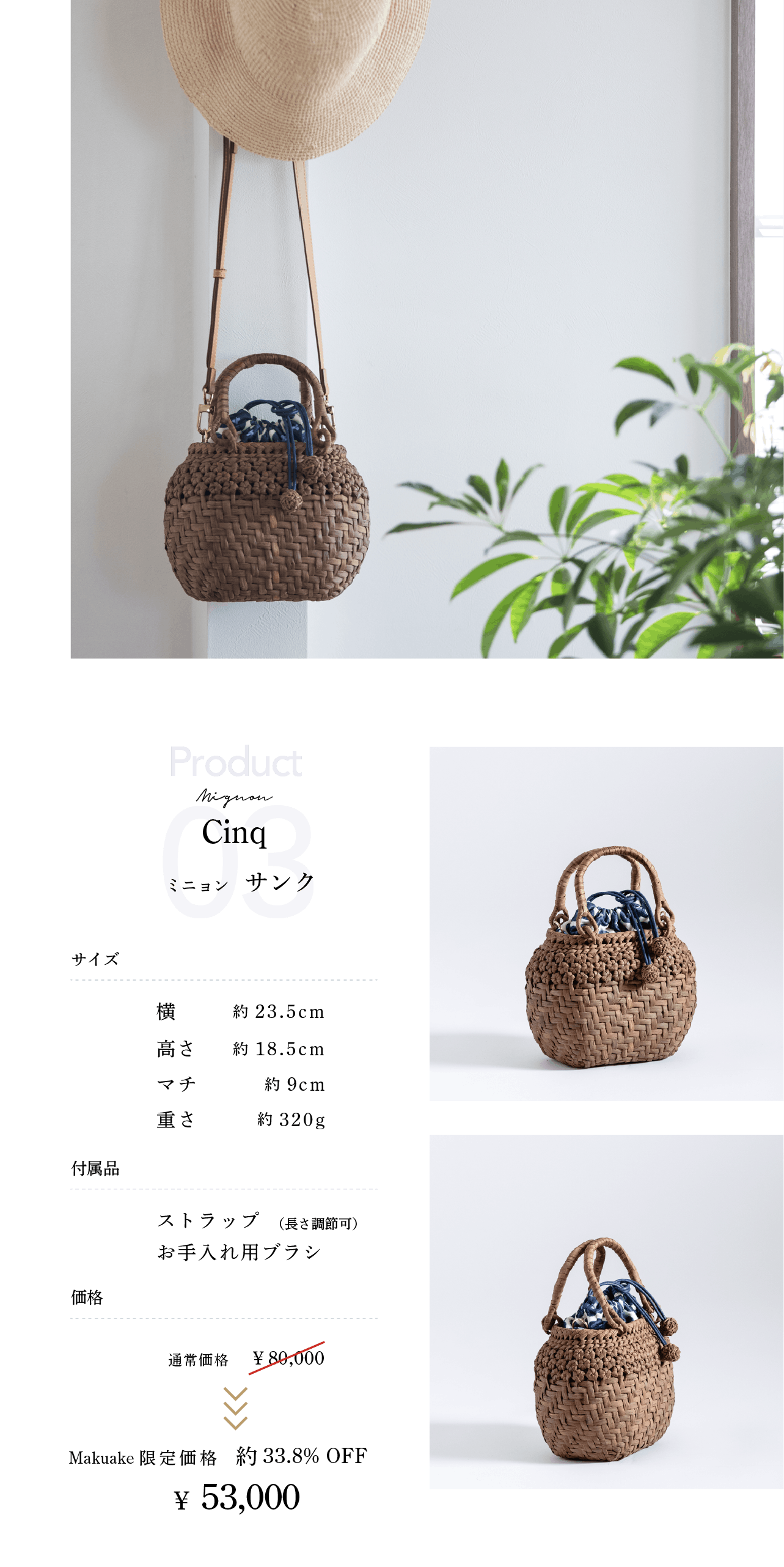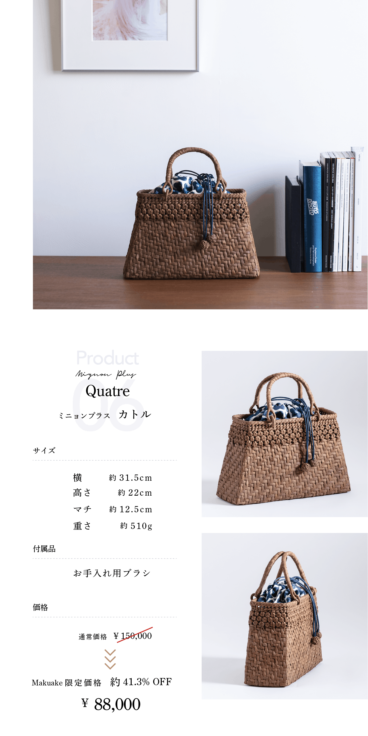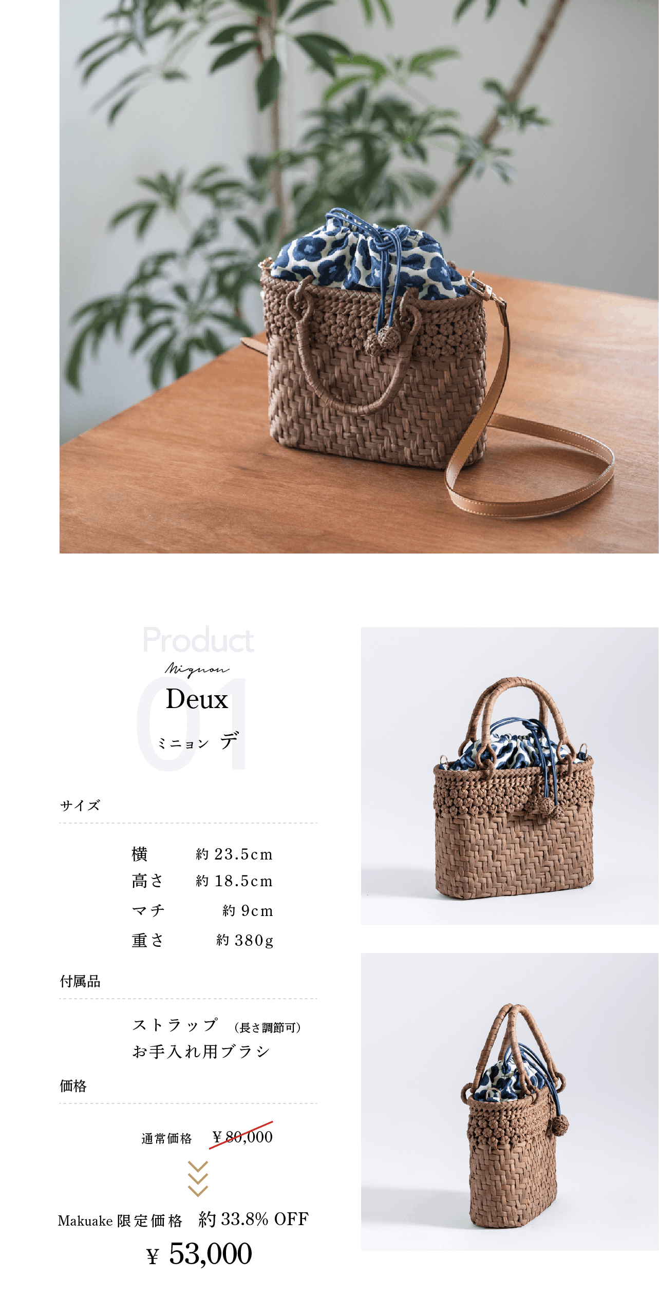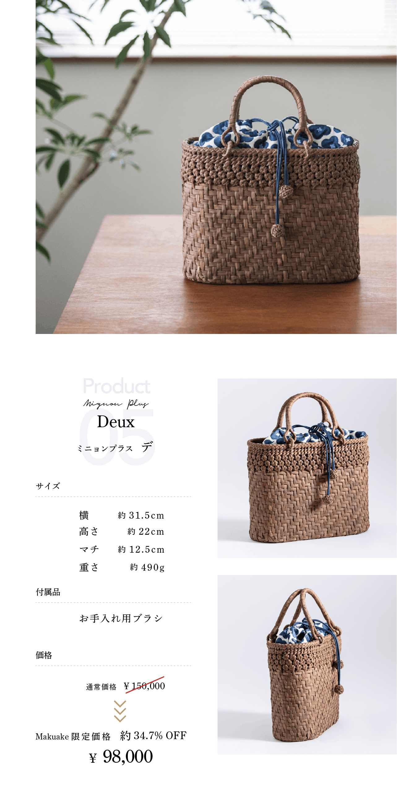 プロジェクトでは小型の籠バッグ、Mignon(ミニョン)に加えて、ひとまわり大きなMignon Plus(ミニョンプラス)をラインナップ。