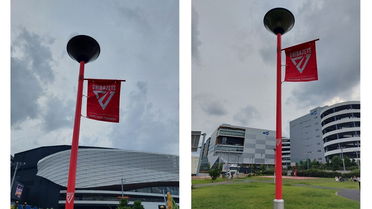 平素より本プロジェクトにご支援を賜り、誠にありがとうございます。船橋市プロスポーツ等連携推進委員会です。皆さま、大変お待たせいたしました。今週より、浜町中央公園の千葉ジェッツ装飾がいよいよスタートいたします。まずは、公園にある照明灯にフラッグ設置とラッピング装飾を行い、シーズン開幕に向けて応援ムードを高めてまいります。これから順次装飾が加わり、どんどん華やかになっていきます。少しずつ姿を変えていく公園の様子を、ぜひお楽しみください。