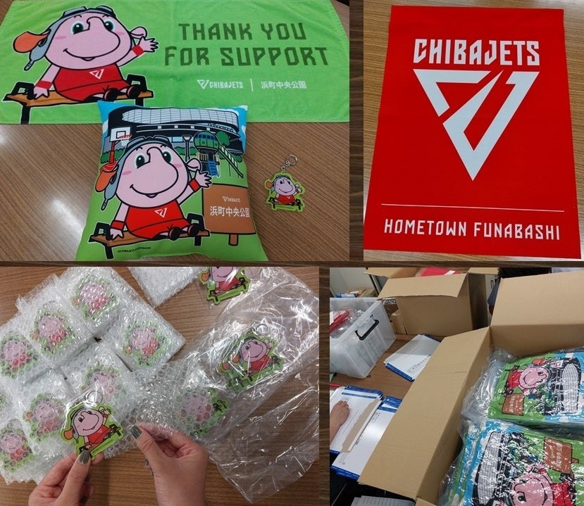 本日、リターン品の【ジャンボくんキーホルダー】【ジャンボくんタオル】【ジャンボくんクッション】【千葉ジェッツフラッグ】を発送いたします。
