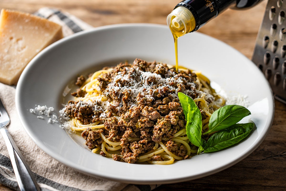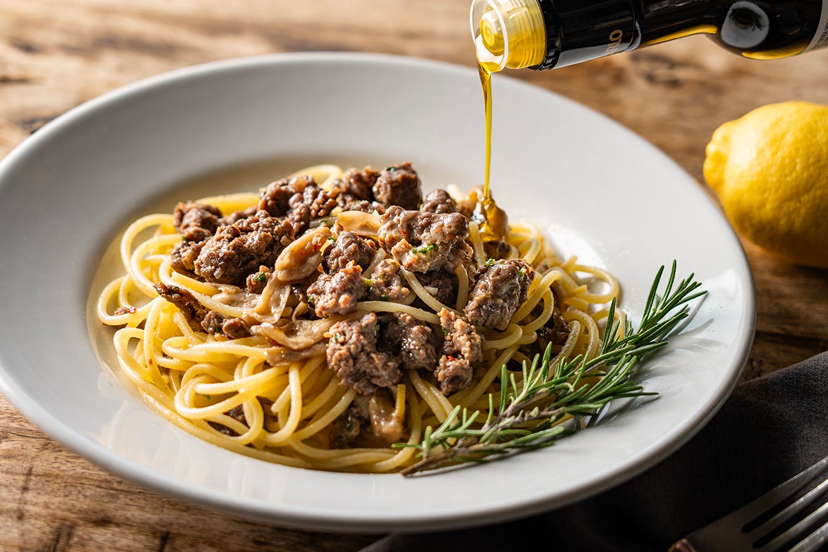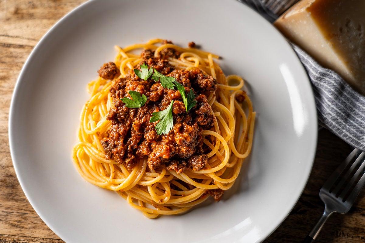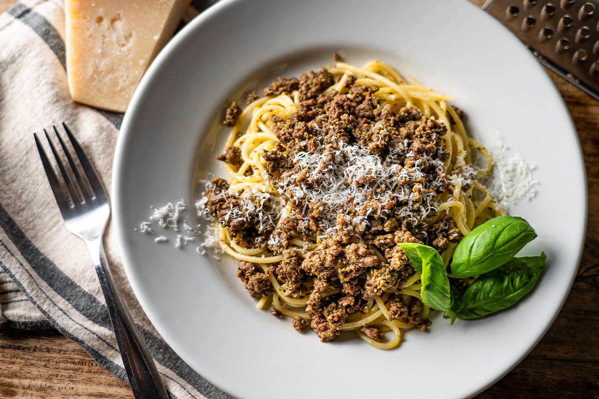 2. パルミジャーノ香る きのことトマトの鹿肉ボロネーゼ