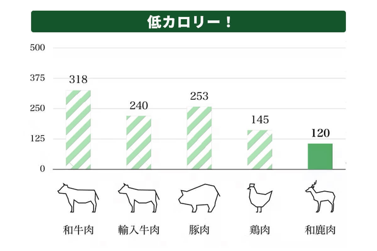 天然の鹿は、天然のうなぎやアユにも感じられる引き締まった肉質が特徴です。低脂質ゆえに低カロリー!なのに高栄養価というヘルシーな赤身肉です。必要ないものが含まれず、必要な栄養が豊富に含まれているスーパーヘルシーフードです。