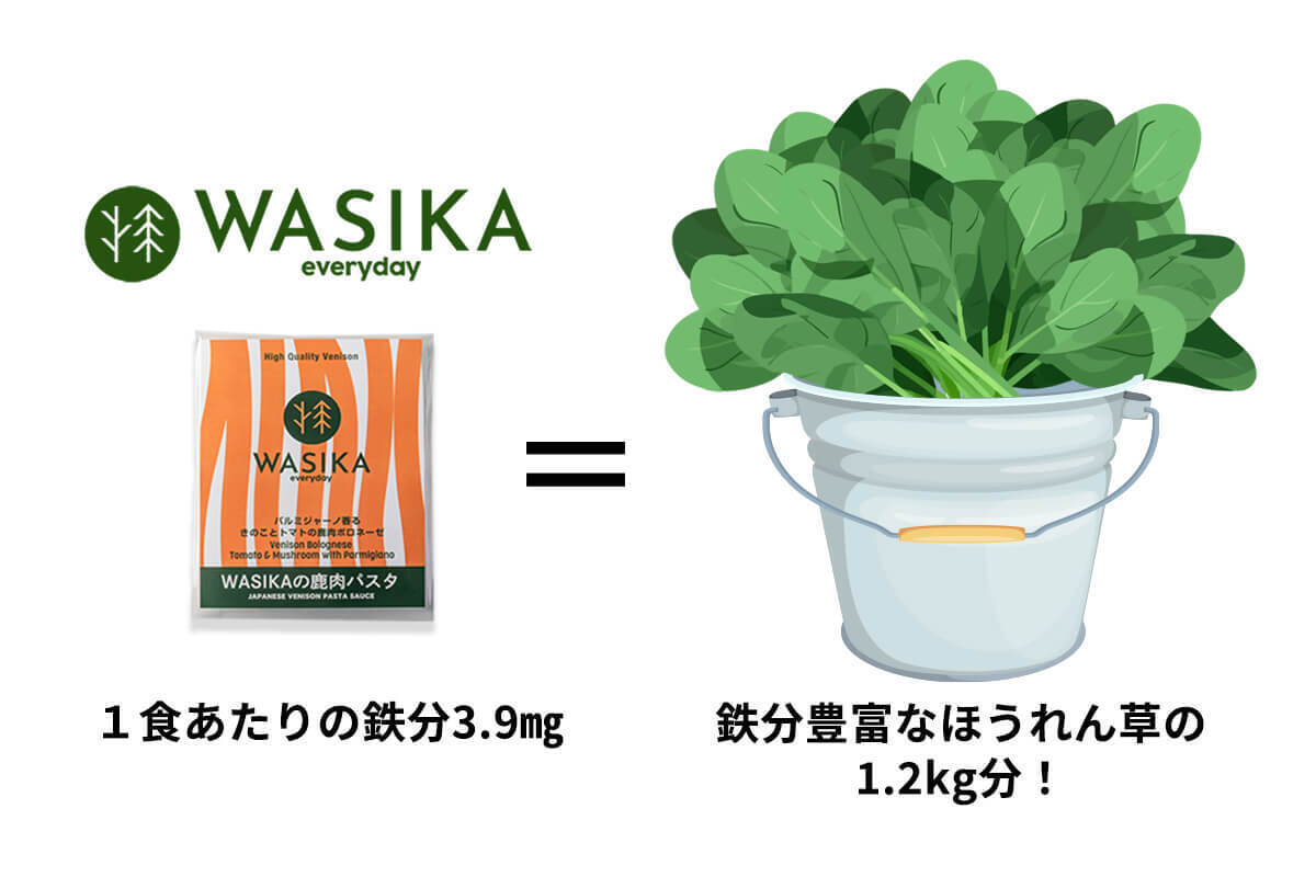 鉄分不足になりがちな食文化の日本人。1日の鉄分をサプリではなく、良質なタンパク質と一緒においしく食事で摂っていただきたい!思いを込めてWASIKA everyday シリーズでは全ての商品1食分にWASIKAの鹿肉100gを使用しています。安価な市販のパスタソース、ごはんのお供もありますが「鹿肉を食べるパスタソース」「鹿肉を食べるライスソース」としてお召し上がりください!