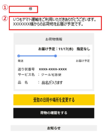 お荷物の送り状番号をヤマト運輸の「荷物問合せシステム」でご都合に合わせて到着日、到着時間帯の変更も可能です。https://toi.kuronekoyamato.co.jp/cgi-bin/tneko
