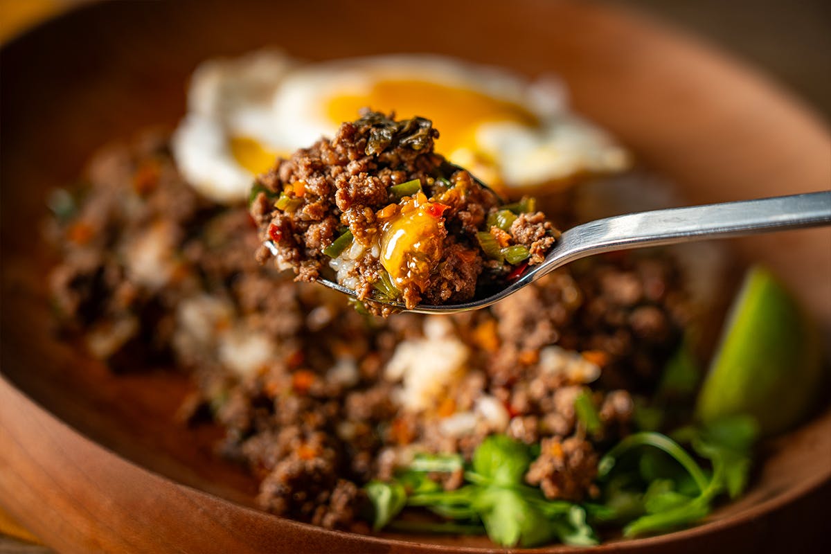 ホーリーバジルの香り、魚醬と唐辛子のうま味と辛味が、食欲をかきたててくれます。目玉焼きやライムを添えるとより 一層おいしくお召し上がりいただけます