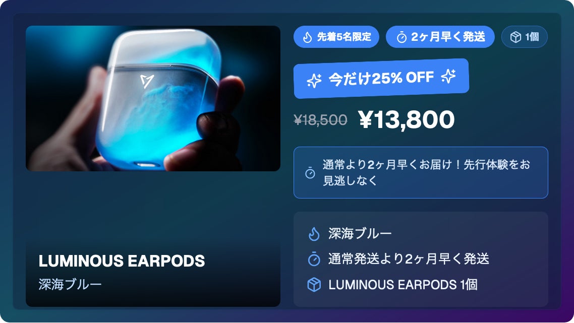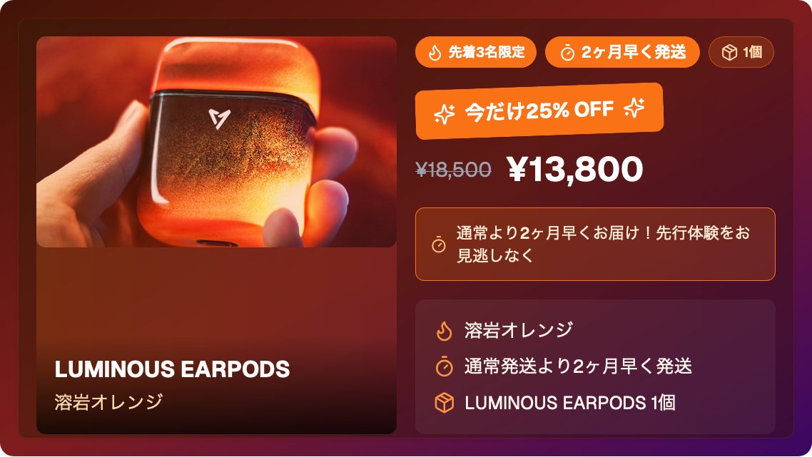 2026/01/16 07:30LUMINOUS EARPODS(光るイヤホン)プロジェクト終了まで、残り3日となりました。今だけ9,800円でご支援いただけます。透明ボディの中を流れる光のデザインと、日常使いを意識した音質・装着感を両立した、「見せる」ことも楽しめる新しいイヤホンです。「気になっていた」「迷っていた」という方は、この3日間が最後のチャンスとなります。プロジェクトページはこちら:https://camp-fire.jp/projects/899644/view本価格でのご提供はプロジェクト期間中のみです。終了後は価格が変更となる可能性がございます。残り3日、最後までどうぞよろしくお願いいたします。 もっと見る