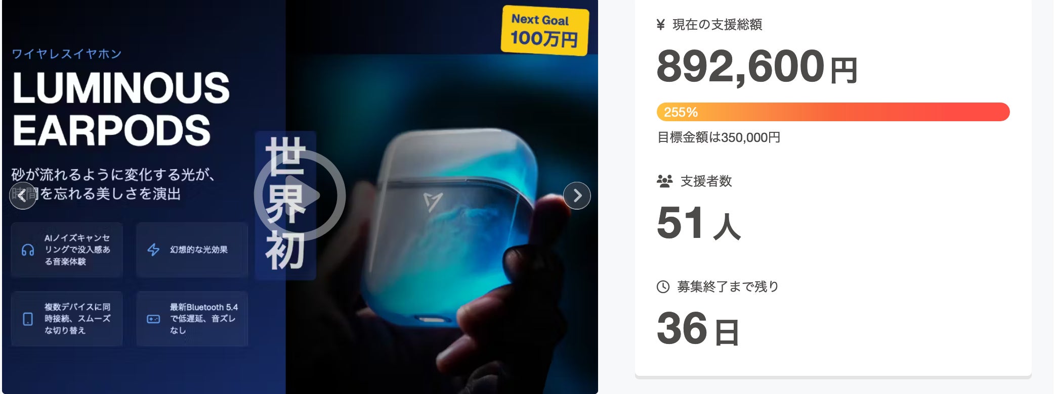 支援者の皆さま、いつも応援ありがとうございます!LUMINOUS EARPODSプロジェクトは、皆さまのご支援のおかげで大きく前進し、現在NEXT GOALの100万円達成まで残り10万円となりました!
