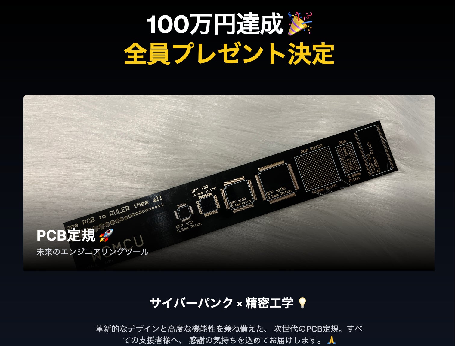 100万円達成を記念して、ささやかではございますが、支援者の皆さま全員にPCB定規をプレゼントすることを決定しました!