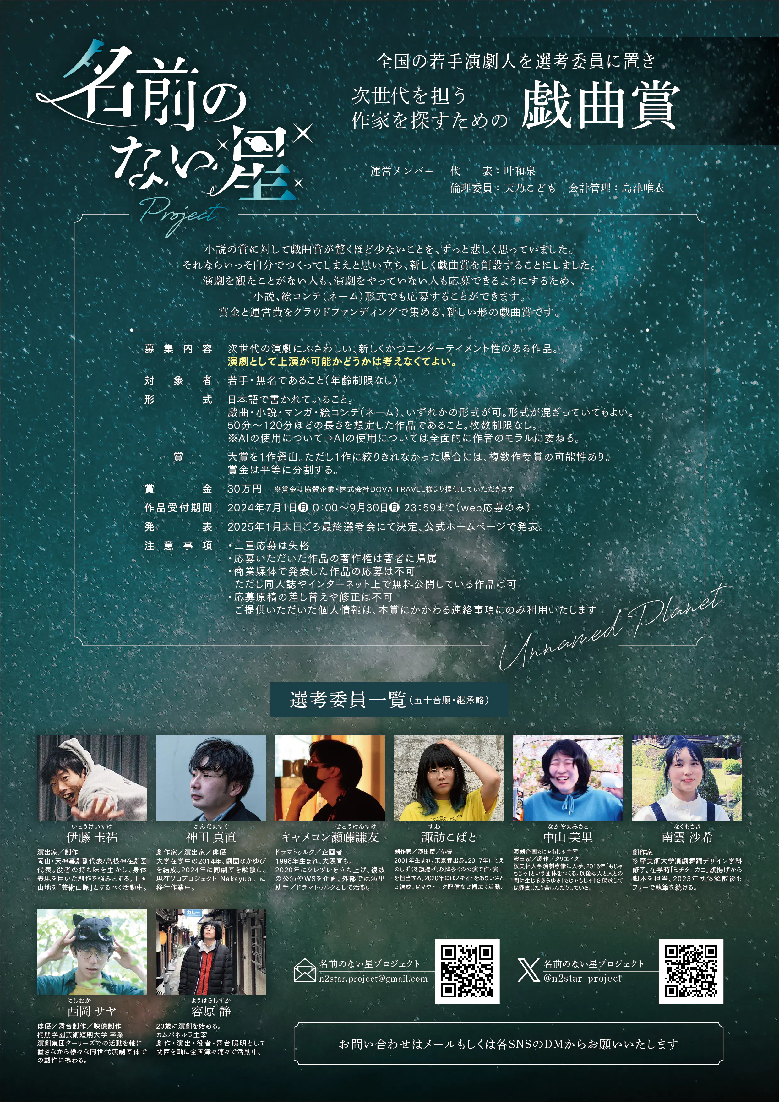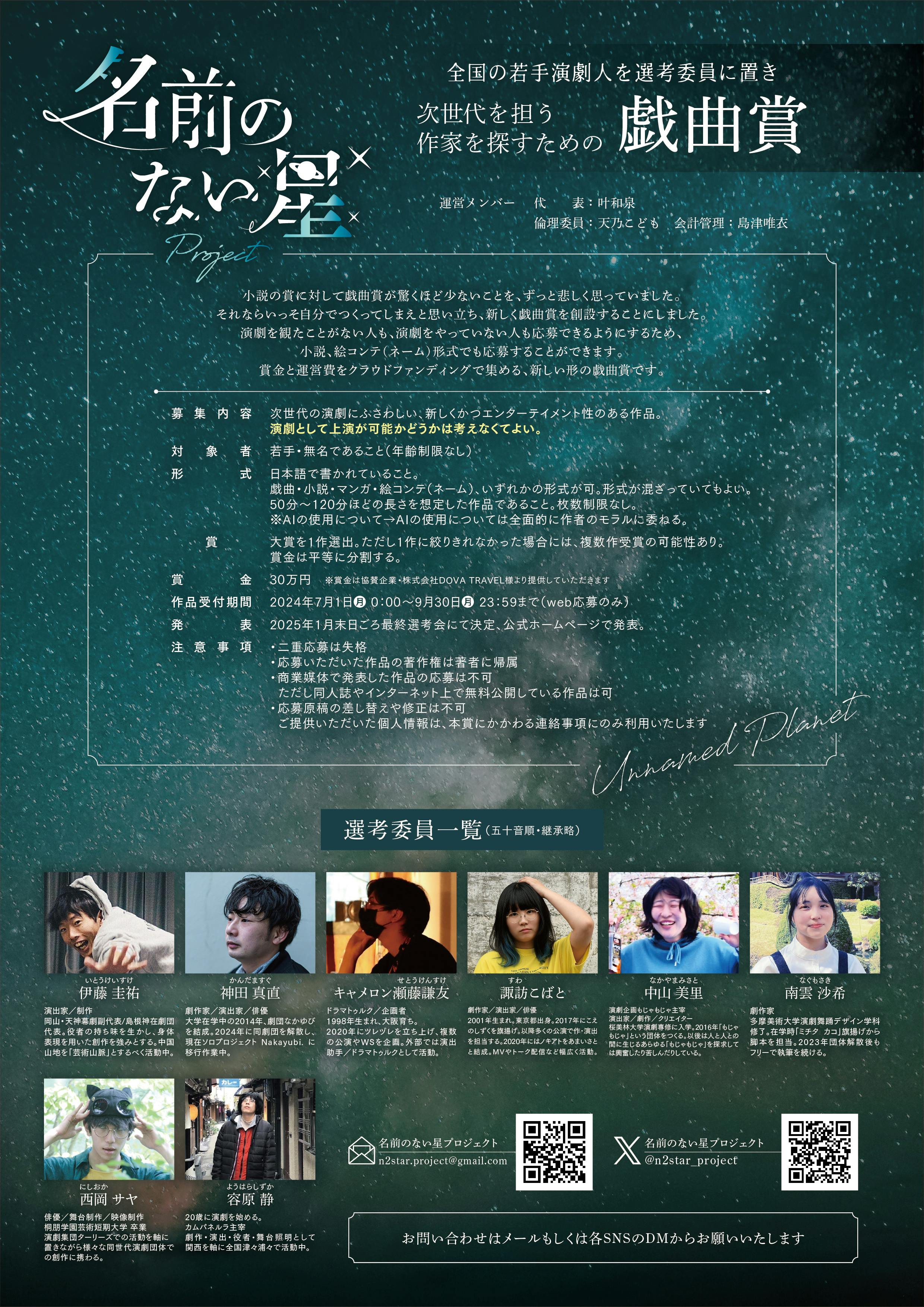 2024年1月1日に「次世代に演劇をつないでいくための実験企画」という趣旨のもと「名前のない星」プロジェクトを作家・劇作家・演出家である叶凪生がひとりで立ち上げました。