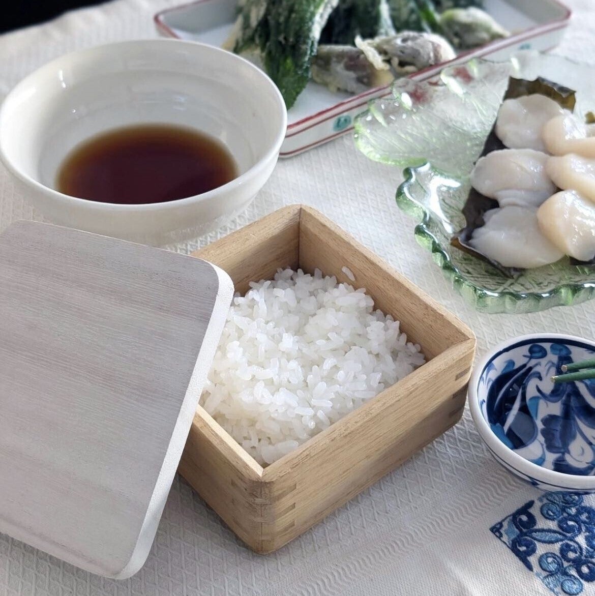 写真は夕食のひととき。ホタテの刺身と桐のレンジでごはん鉢です。