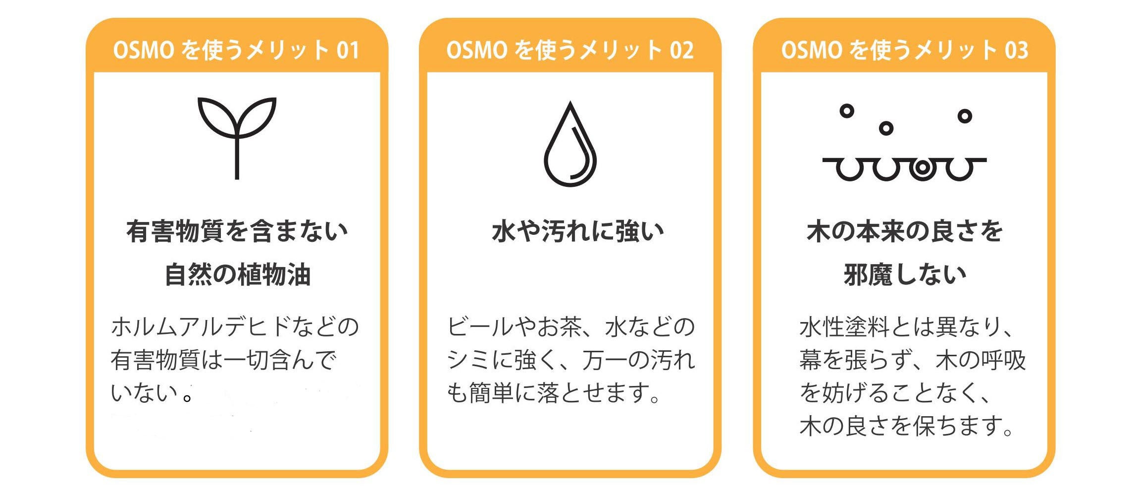 オスモカラーは自然の植物油からできており水性塗料のように膜を張らず木に深く浸透し木の呼吸を妨げることなくいつまでも木を自然な状態に保ちます。水などのシミに強く万が一の汚れも簡単に落とせます。