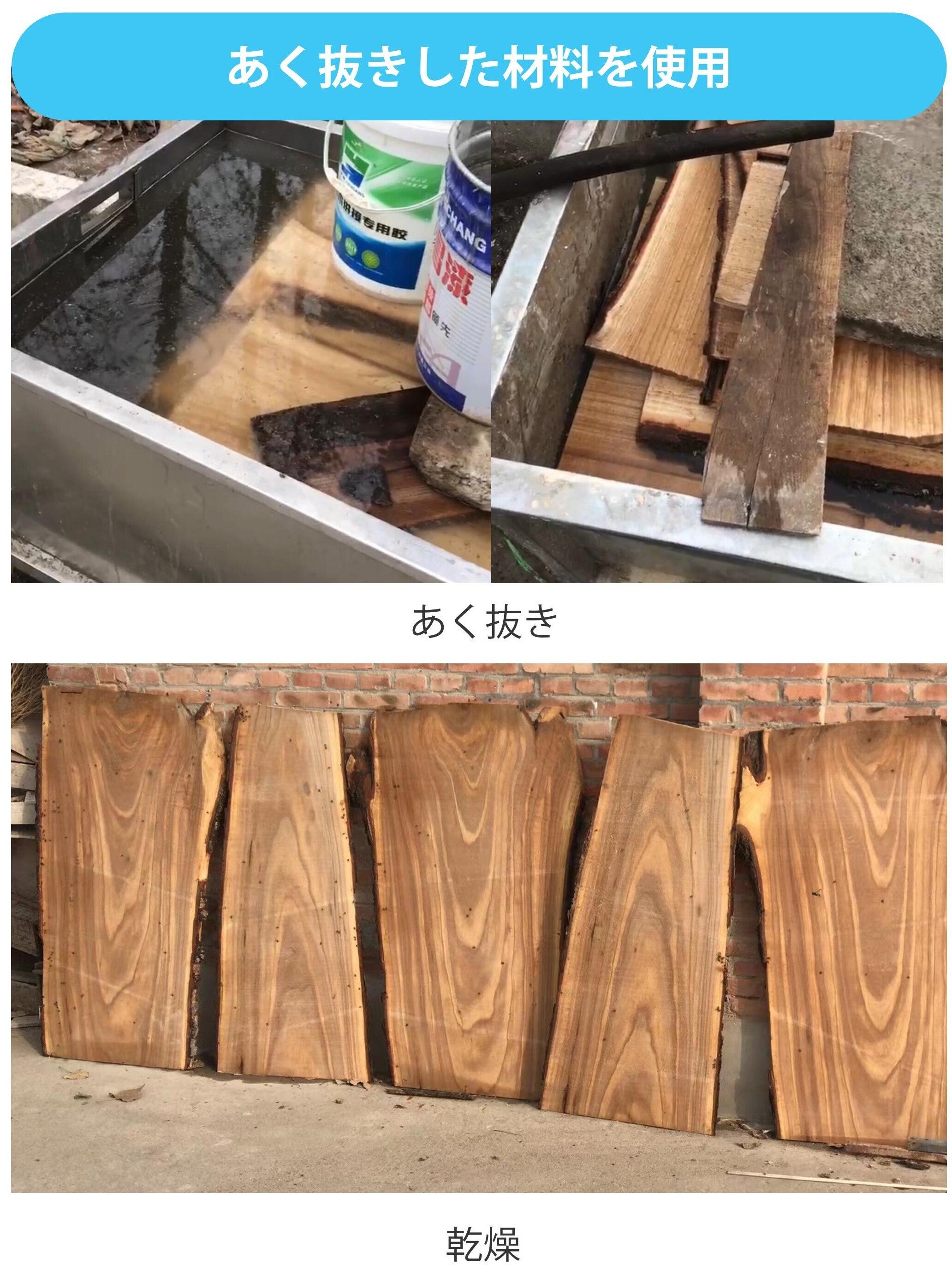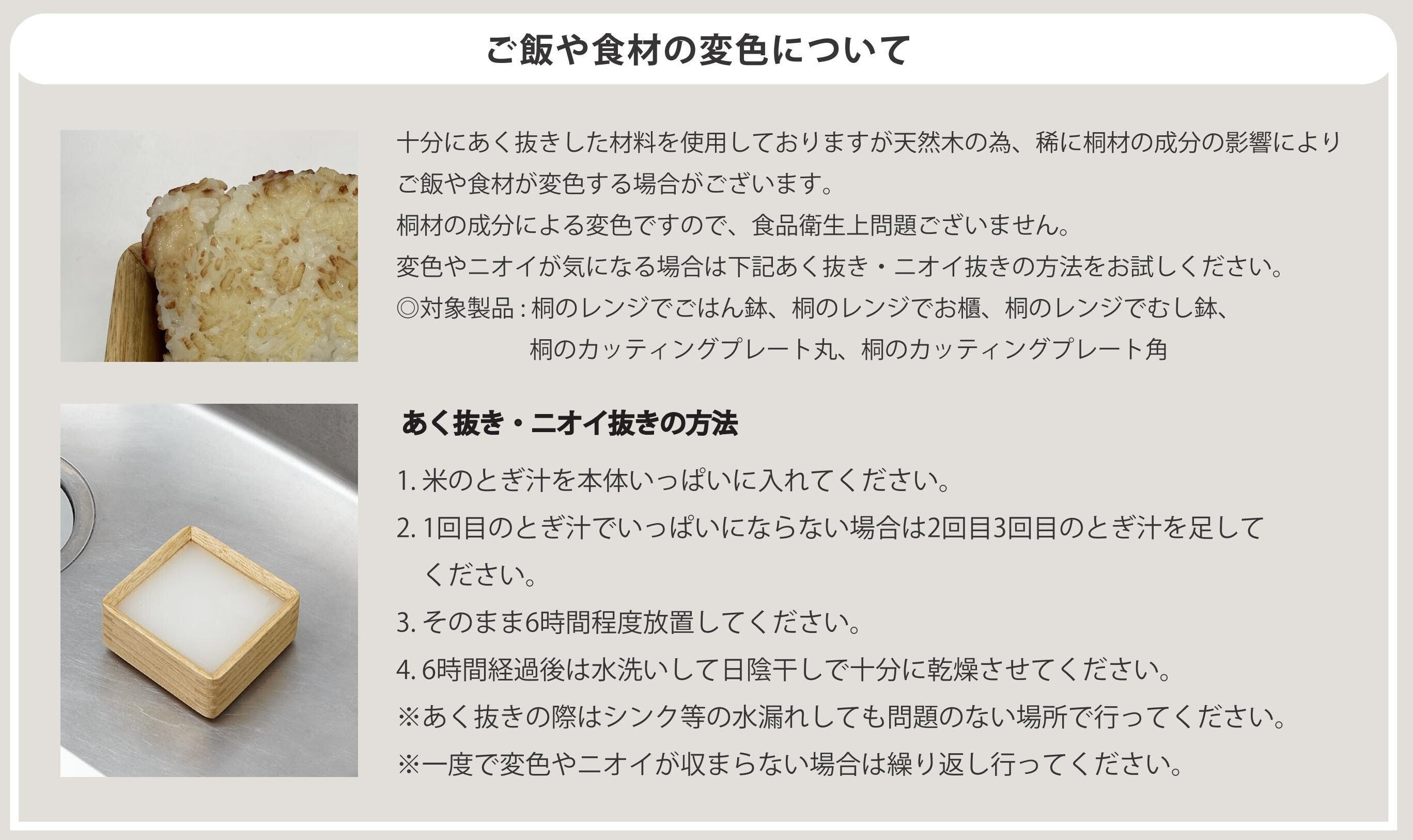 ※桐の香りの感じ方には個人差があります。ご使用の中で徐々に弱まりますが、気になる方は上記記載のあく抜き・ニオイ抜きの方法をお試しください。