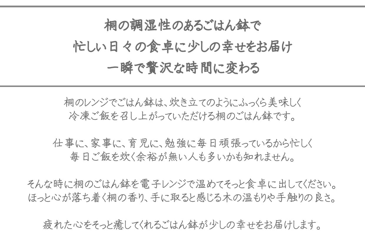 お家に疲れて帰って食事の支度をする時間が無い…そんな時にも冷凍庫から桐のレンジでごはん鉢を出して、レンジでご飯を温めて、さっとたまごかけごはんを食べるだけも少し幸せな気持ちになれるかも…