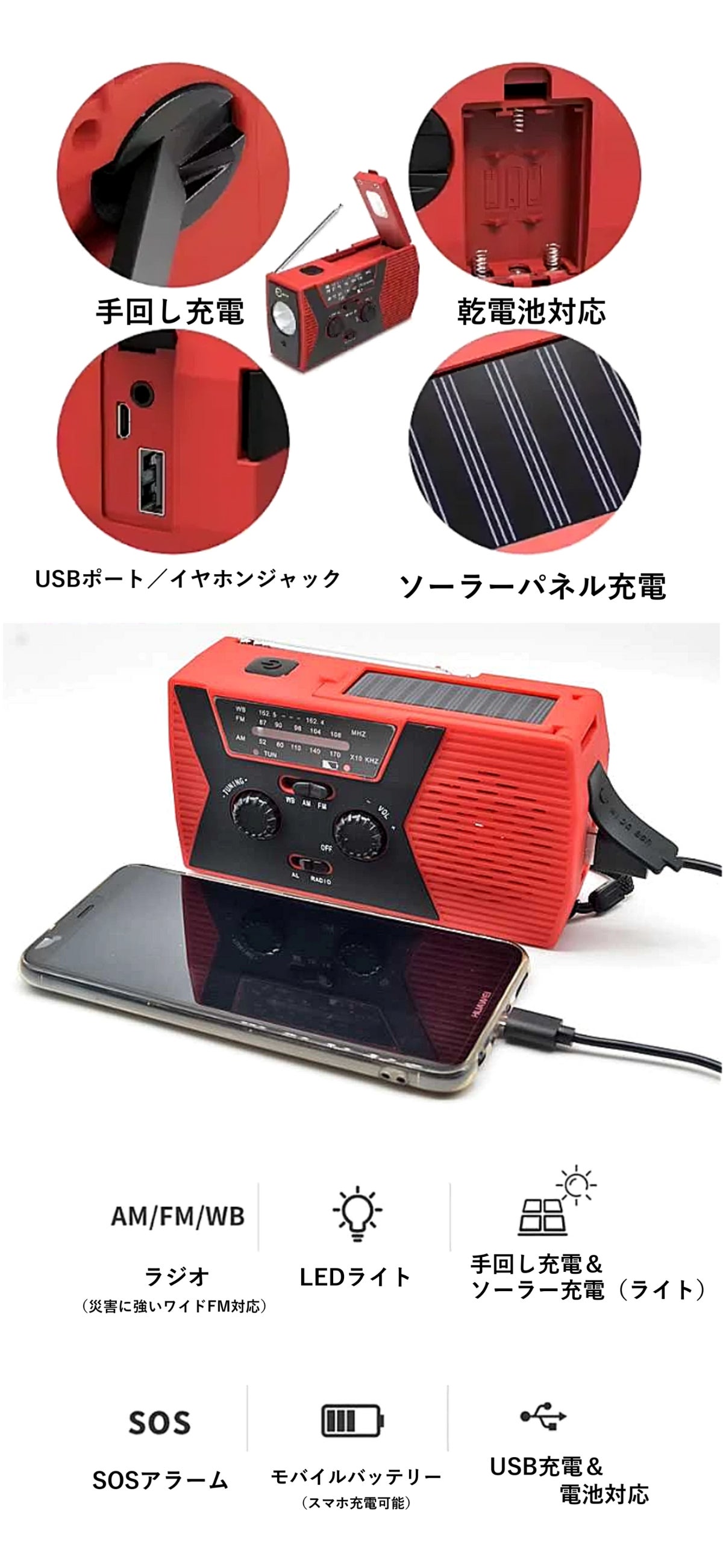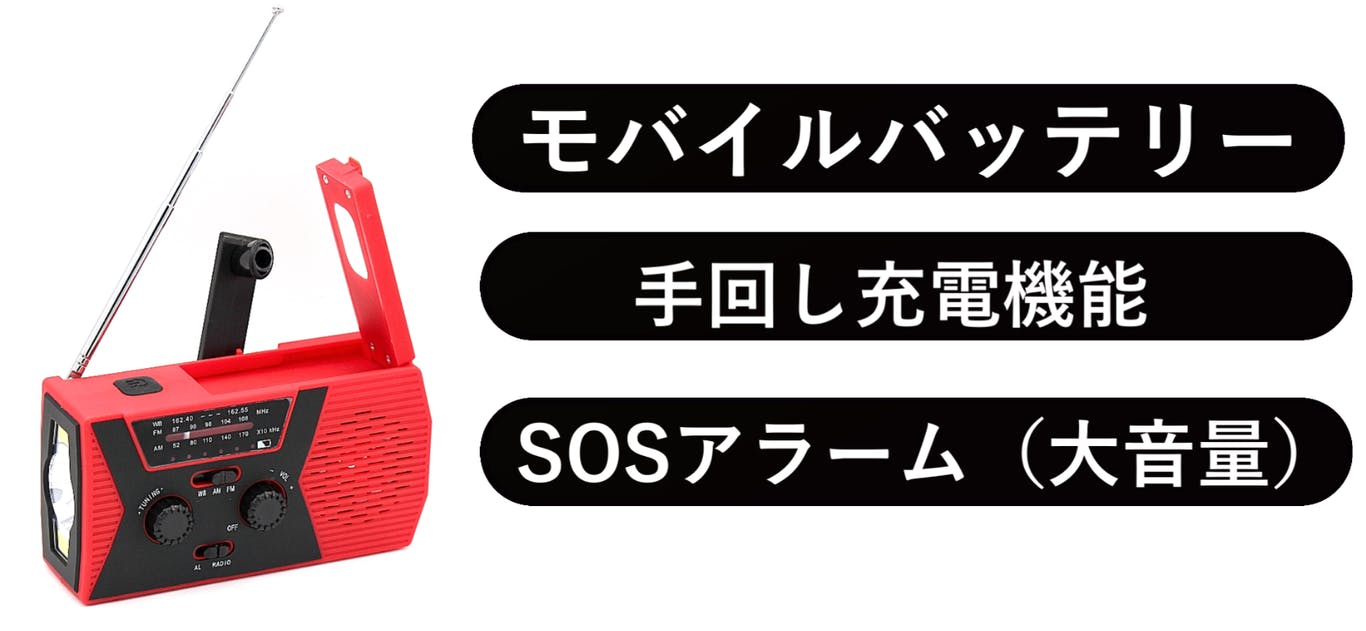 スピーカー&SOS赤色アラーム、底にSOSスイッチ(AAA/リチウムイオン電源)、LEDライトスイッチ、ラジオバンド採用。