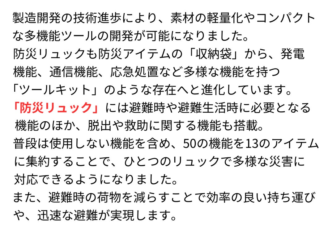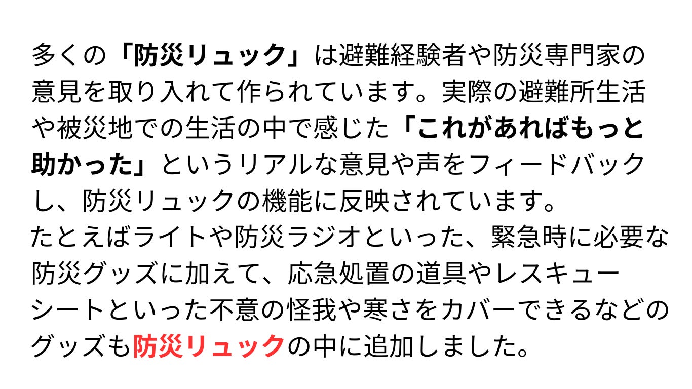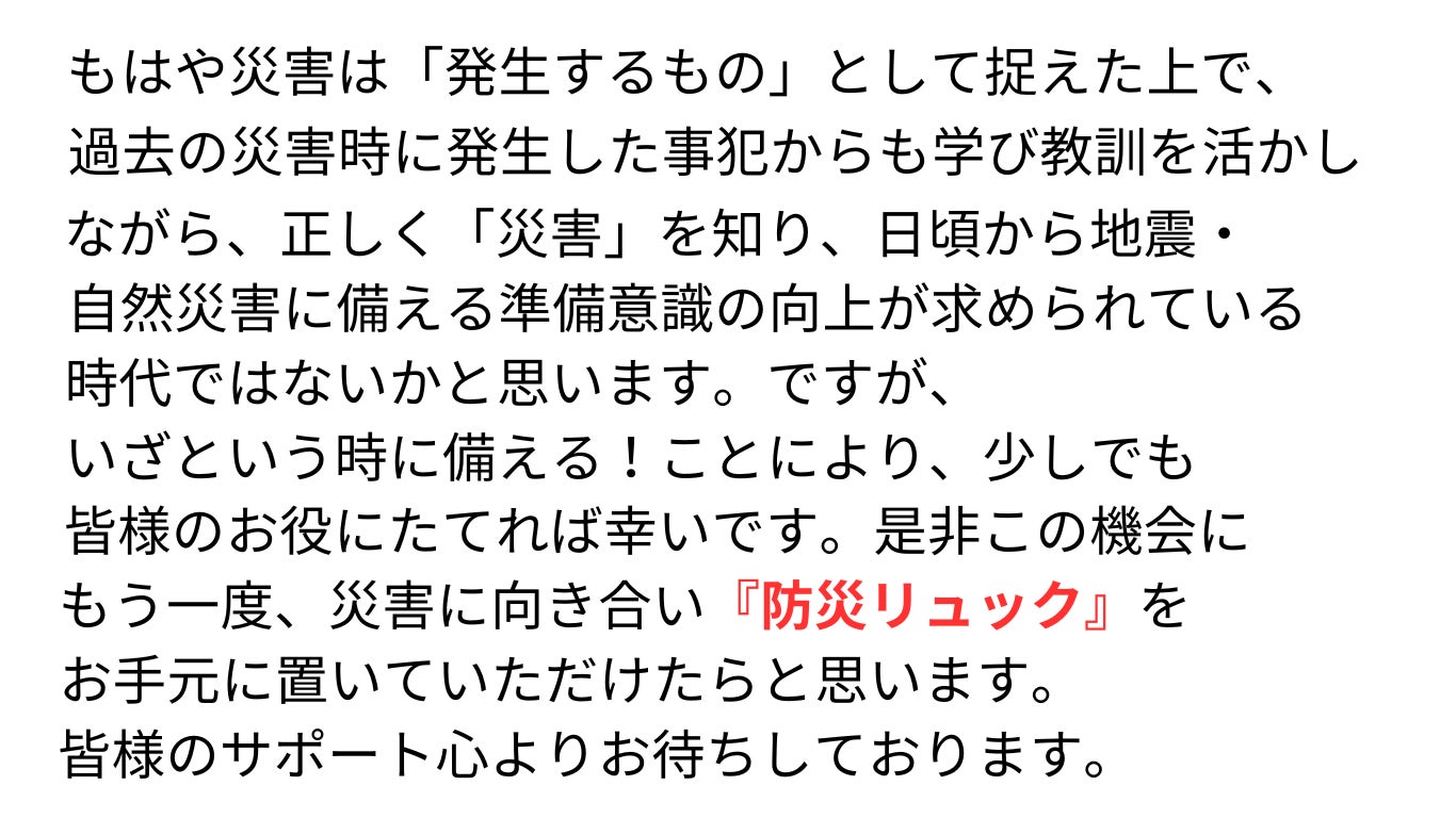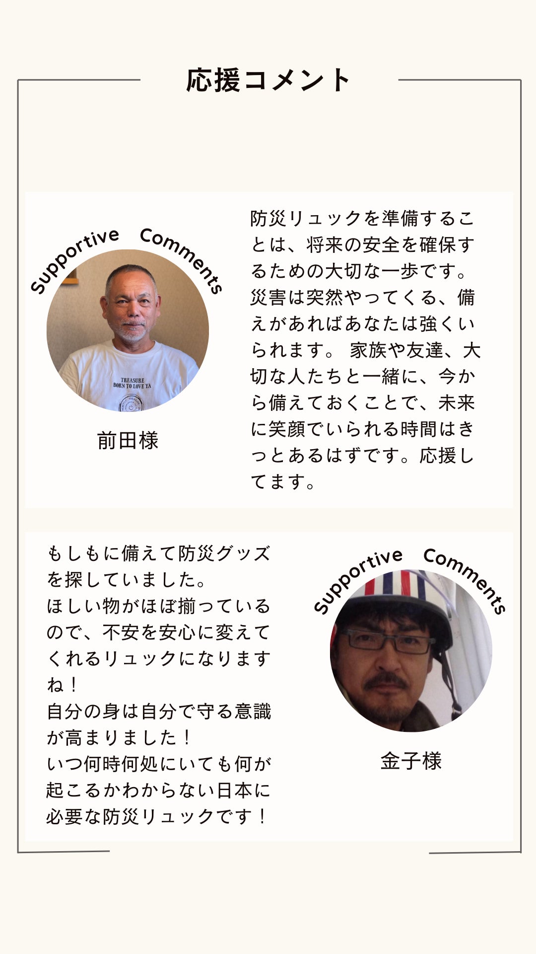 2025/03/27 19:00この度は、【新世代型 防災リュック】のプロジェクトをご支援いただきまして、誠にありがとうございます。大変お待たせしました。3/23に【すべてのリターンの検品・発送が完了】しましたことをご報告させていただきます。一部リターン品においては、お届けまでいましばらくお時間いただきますこと、ご了承お願い致します。【お礼とお願い】今回、本当にたくさんの方にご支援していただきました。支援者さまの一部の方へはご支援を頂けた理由やご利用用途などをお伺いさせていただき、「地震に備えて」「もしもの時のための安心のため」であるなどとお伺いすることができました。皆様がすでにご存知であることを承知でぜひお伝えさせていただきたいことがございます。それは防災グッズや災害用具はとても大切なものですが、もっと重要で備える必要があるのは、やはり皆様自身の「災害に関する知識」や「防災への準備」であると考えております。特に- 地域における災害リスク (地震、水害、台風、土砂災害など)-災害には地域性があります。それぞれの災害に応じて避難経路や避難場所も変わってきますので、避難時のイメージなどをぜひ準備されて下さい。以下のサイトよりお住まいの近くの避難所をご検索頂けます。▼Yahoo! JAPAN【避難場所マップ】https://crisis.yahoo.co.jp/map/-避難方法(誰と、どこに、どうやって)-避難時に介助が必要な高齢者の方やお子様がいらっしゃる場合は、それも含めて避難準備をしておく必要がございます。これらの知識や準備のもとに【防災リュック】が皆様のお役に立てると大変嬉しく思います。私達はこのプロジェクトを通して学んだ皆様の思いをしっかりとこれからの取り組みへ活かして参ります。引き続き4inchプロジェクトをよろしくお願い致します!また、応援していただきました皆様に「もしも」のことがないことを願っています。‐4inch.プロジェクトチーム‐////////【公式LINE】////////【 https://lin.ee/LmAcElk 】●アフターサポートも公式LINEにて承っております。●「日頃の感謝を込めて。」\オンラインストア/初回限定!¥2000円OFFクーポン配布中!(全商品対象)(※公式LINEお友達登録にて皆様お使いいただけます。)////////【公式Instagram】////////【 https://www.instagram.com/_4inch_/ 】\日々商品開発や極寒実験の様子などを気軽にアップしています♪/★『フォロー&いいね』でプレゼント企画随時実施中!【寝袋やエアピローなどのキャンプグッズが当たります!】////////【オンラインストア】////////【 https://4inch.store/ 】\NASA宇宙服断熱素材「エアロゲル」を採用の寝袋やブランケットなどを展開しています!/LINEクーポン配布中で全商品2000円OFF割引あり!(※初回限定クーポンとなります。) もっと見る【災害対策】防災リュック‐プロジェクト終了残り2日となりました!‐