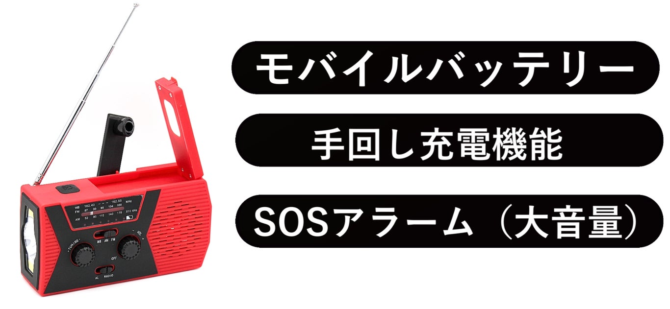 スピーカー&SOS赤色アラーム、底にSOSスイッチ(AAA/リチウムイオン電源)、LEDライトスイッチ、ラジオバンド採用。