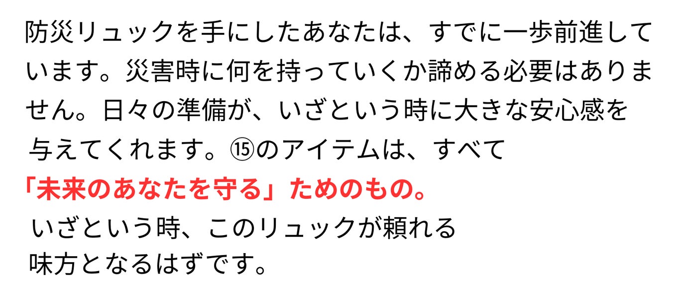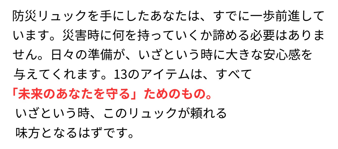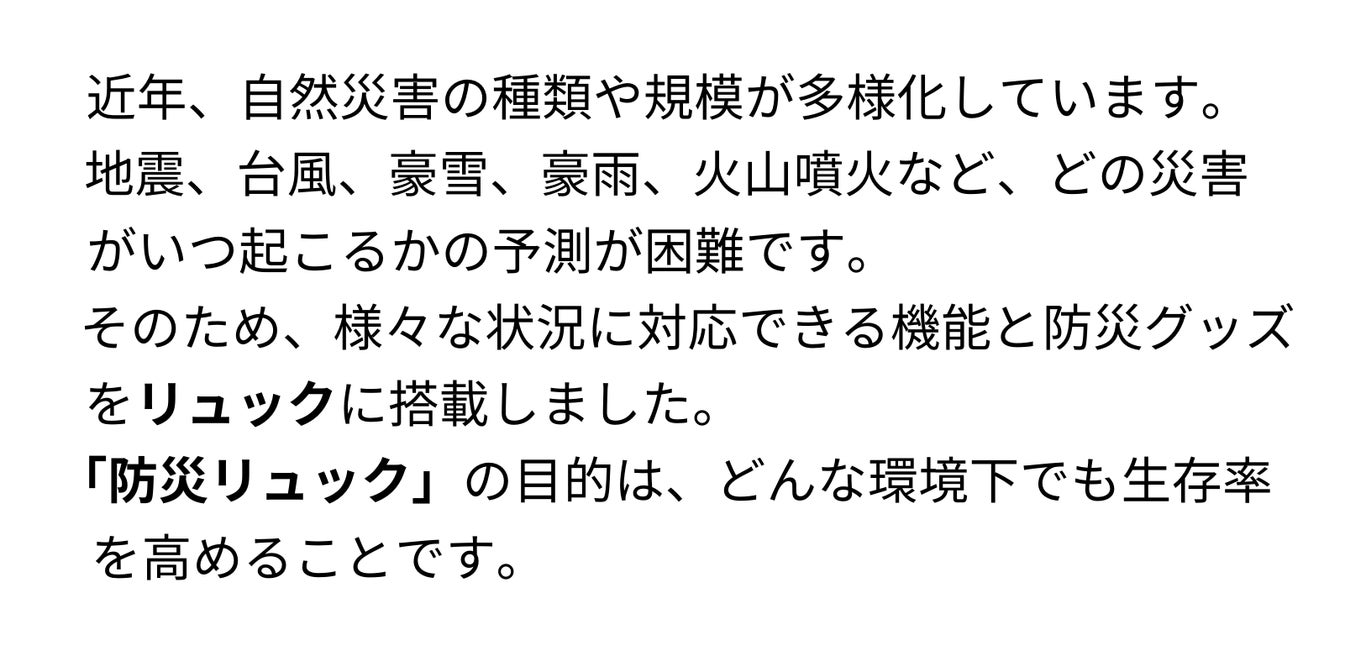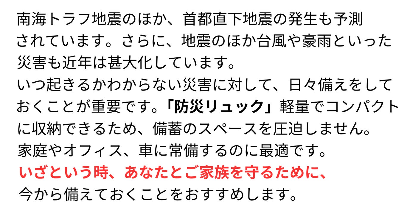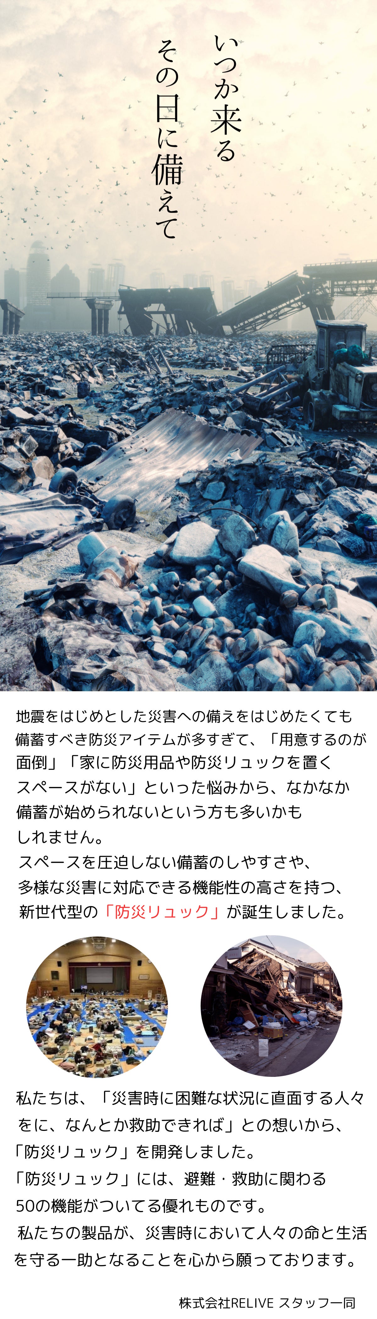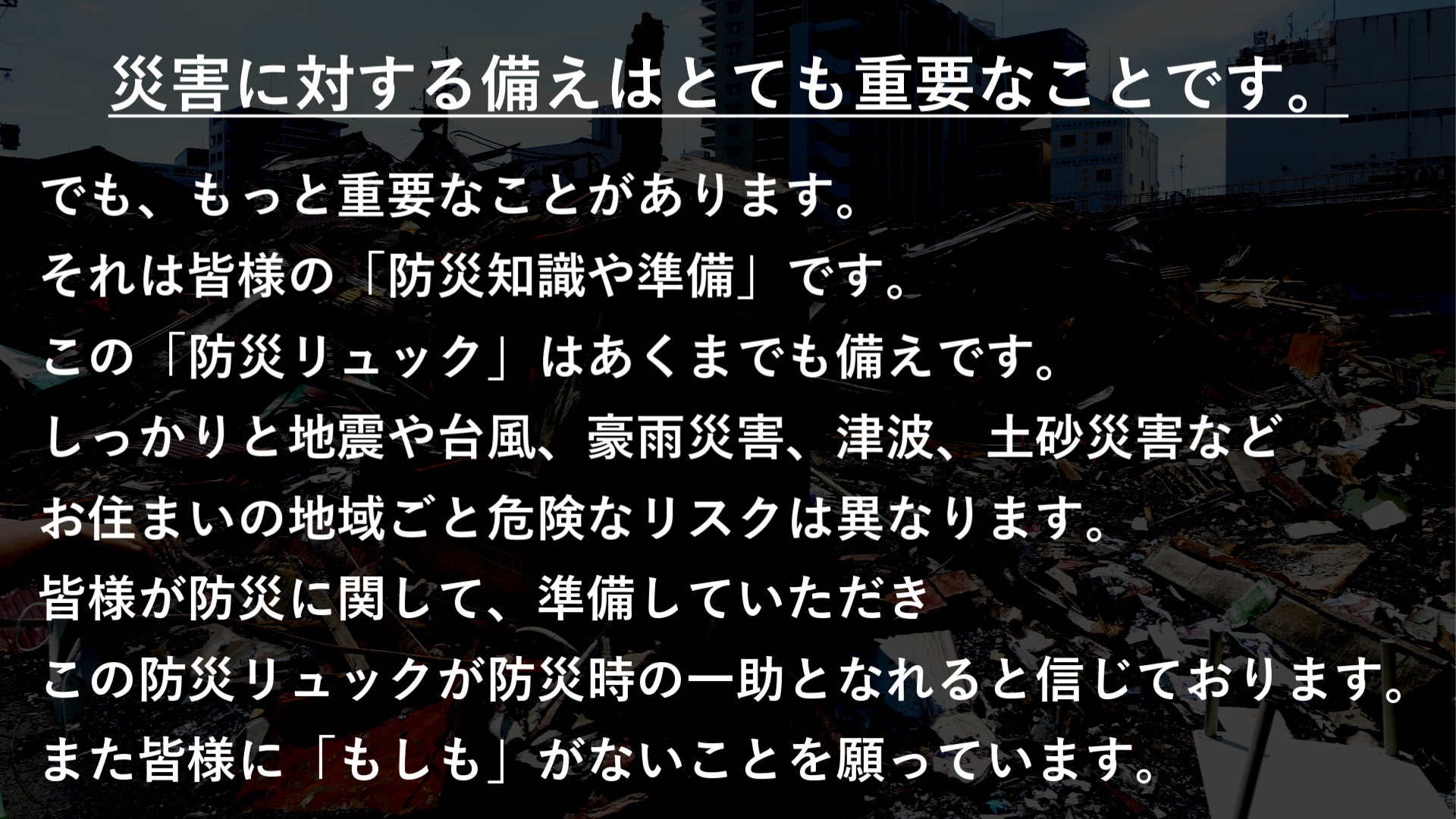 2025/03/27 19:00この度は、【新世代型 防災リュック】のプロジェクトをご支援いただきまして、誠にありがとうございます。大変お待たせしました。3/23に【すべてのリターンの検品・発送が完了】しましたことをご報告させていただきます。一部リターン品においては、お届けまでいましばらくお時間いただきますこと、ご了承お願い致します。【お礼とお願い】今回、本当にたくさんの方にご支援していただきました。支援者さまの一部の方へはご支援を頂けた理由やご利用用途などをお伺いさせていただき、「地震に備えて」「もしもの時のための安心のため」であるなどとお伺いすることができました。皆様がすでにご存知であることを承知でぜひお伝えさせていただきたいことがございます。それは防災グッズや災害用具はとても大切なものですが、もっと重要で備える必要があるのは、やはり皆様自身の「災害に関する知識」や「防災への準備」であると考えております。特に- 地域における災害リスク (地震、水害、台風、土砂災害など)-災害には地域性があります。それぞれの災害に応じて避難経路や避難場所も変わってきますので、避難時のイメージなどをぜひ準備されて下さい。以下のサイトよりお住まいの近くの避難所をご検索頂けます。▼Yahoo! JAPAN【避難場所マップ】https://crisis.yahoo.co.jp/map/-避難方法(誰と、どこに、どうやって)-避難時に介助が必要な高齢者の方やお子様がいらっしゃる場合は、それも含めて避難準備をしておく必要がございます。これらの知識や準備のもとに【防災リュック】が皆様のお役に立てると大変嬉しく思います。私達はこのプロジェクトを通して学んだ皆様の思いをしっかりとこれからの取り組みへ活かして参ります。引き続き4inchプロジェクトをよろしくお願い致します!また、応援していただきました皆様に「もしも」のことがないことを願っています。‐4inch.プロジェクトチーム‐////////【公式LINE】////////【 https://lin.ee/LmAcElk 】●アフターサポートも公式LINEにて承っております。●「日頃の感謝を込めて。」\オンラインストア/初回限定!¥2000円OFFクーポン配布中!(全商品対象)(※公式LINEお友達登録にて皆様お使いいただけます。)////////【公式Instagram】////////【 https://www.instagram.com/_4inch_/ 】\日々商品開発や極寒実験の様子などを気軽にアップしています♪/★『フォロー&いいね』でプレゼント企画随時実施中!【寝袋やエアピローなどのキャンプグッズが当たります!】////////【オンラインストア】////////【 https://4inch.store/ 】\NASA宇宙服断熱素材「エアロゲル」を採用の寝袋やブランケットなどを展開しています!/LINEクーポン配布中で全商品2000円OFF割引あり!(※初回限定クーポンとなります。) もっと見る【災害対策】防災リュック‐プロジェクト終了残り2日となりました!‐