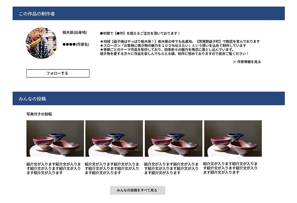 Facebookやmixiのように、サイトのユーザーさんがコミュニティを立ち上げて管理できる機能をつける予定です。例えば「集まれぐい呑みコレクター」「沖縄の琉球三線を語ろう」、あるいは日々の暮らしの記録など、自由に好きなコミュニティを作って盛り上がってもらえたらと考えています。サイトにはマイページ機能をつけ、購入履歴やレビュー履歴も載せられるようにする予定です。