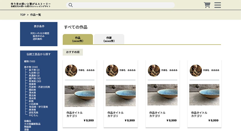 今までにありそうでなかった新しい形のモール型ショッピングサイトになります。個人的に焼き物作家さんの知り合いが多いですが、日本全国の伝統工芸士さんたちを紹介のまた紹介で繋がっていますので、想いのある作り手さん達の想いを熱く代弁できる販売ページ作りをしていきます。