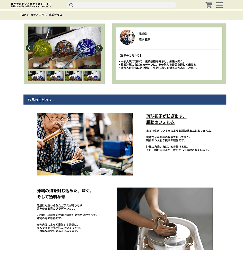 ① 作り手の制作にあたっての背景や想い、なぜその仕事にたずさわっているのか、などのストーリーを全面に出してエピソードを知ってもらってから商品が購入できるモール型ショッピングサイトを作りたい。