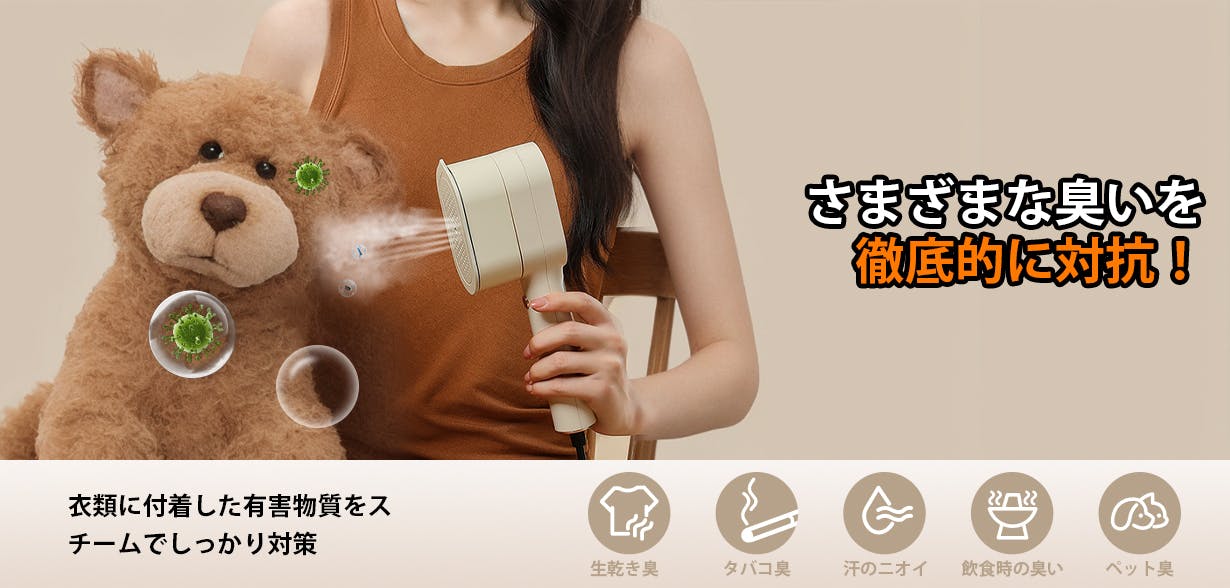 「WT-GT1」は最大130°Cの高温スチームを噴出でき、10ml/分のスチーム量と相まって、衣類に付いた気になるニオイを効果的に除去します。