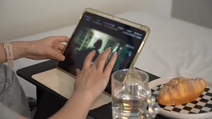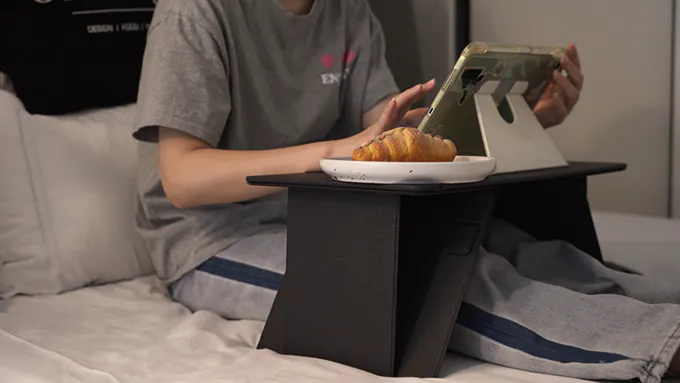 広げるとベッド用のテーブルとして活用でき、リラックスしながら映画鑑賞や読書が可能です。ふかふかのベッドの上で、快適な作業環境をすぐに整えることができます。